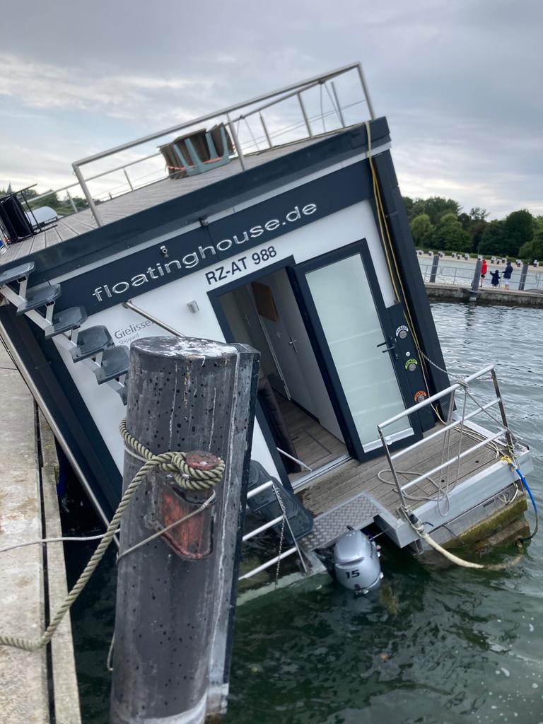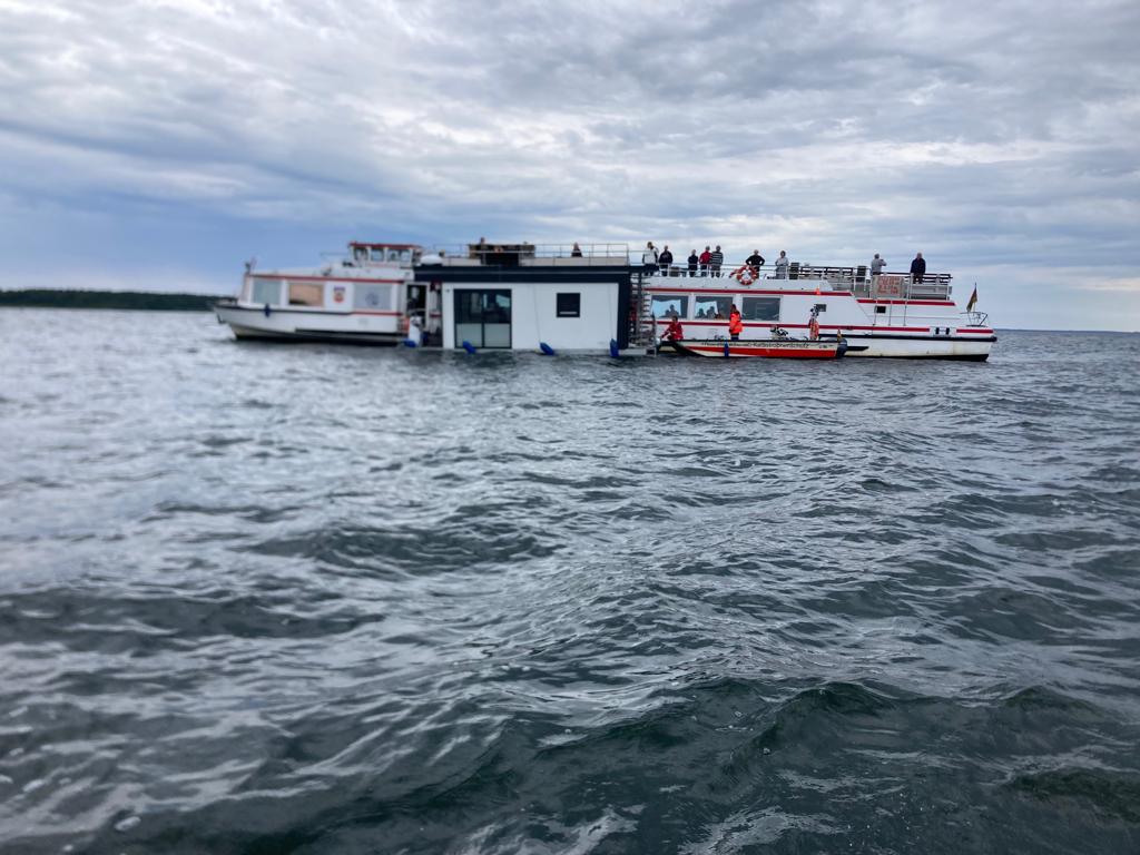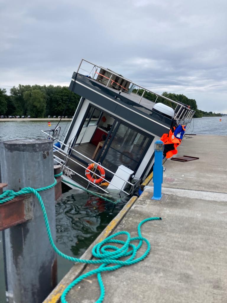 Die Besatzung eines Fahrgastschiffes erkannte das Dilemma und eilte zur Hilfe. Sie konnten das Hausboot, das schon richtig schief lag, an die Leine nehmen und so ein weiteres Absinken verhindern.