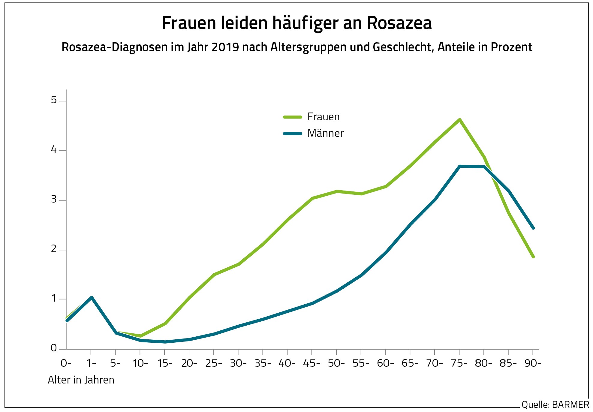 „Der Verlauf einer Rosazea kann durch Medikamente verlangsamt werden. Zusätzlich sollten die Betroffenen neben der Sonne Stress, Alkohol, warme Getränke und scharf gewürzte Speisen meiden. Sie sollten milde, pH-neutrale Waschlotionen sowie Kosmetika ohne Methanol und Kampfer nutzen“, sagt Petzold. Die Hautkrankheit komme verstärkt ab dem 25. Lebensjahr vor, und zwar hauptsächlich bei Frauen. In der Altersklasse von 75 bis 80 Jahren sei im Jahr 2019 am häufigsten eine Rosazea diagnostiziert worden, und zwar bei 4,63 Prozent der Frauen und 3,69 Prozent der Männer. Dies gehe aus einer Analyse der BARMER hervor. „Wer an der Rosazea leidet, sollte sich regelmäßig von der Hautärztin oder dem Hautarzt untersuchen lassen. Auch eine regelmäßige augenärztliche Kontrolle ist erforderlich“, so Petzold.