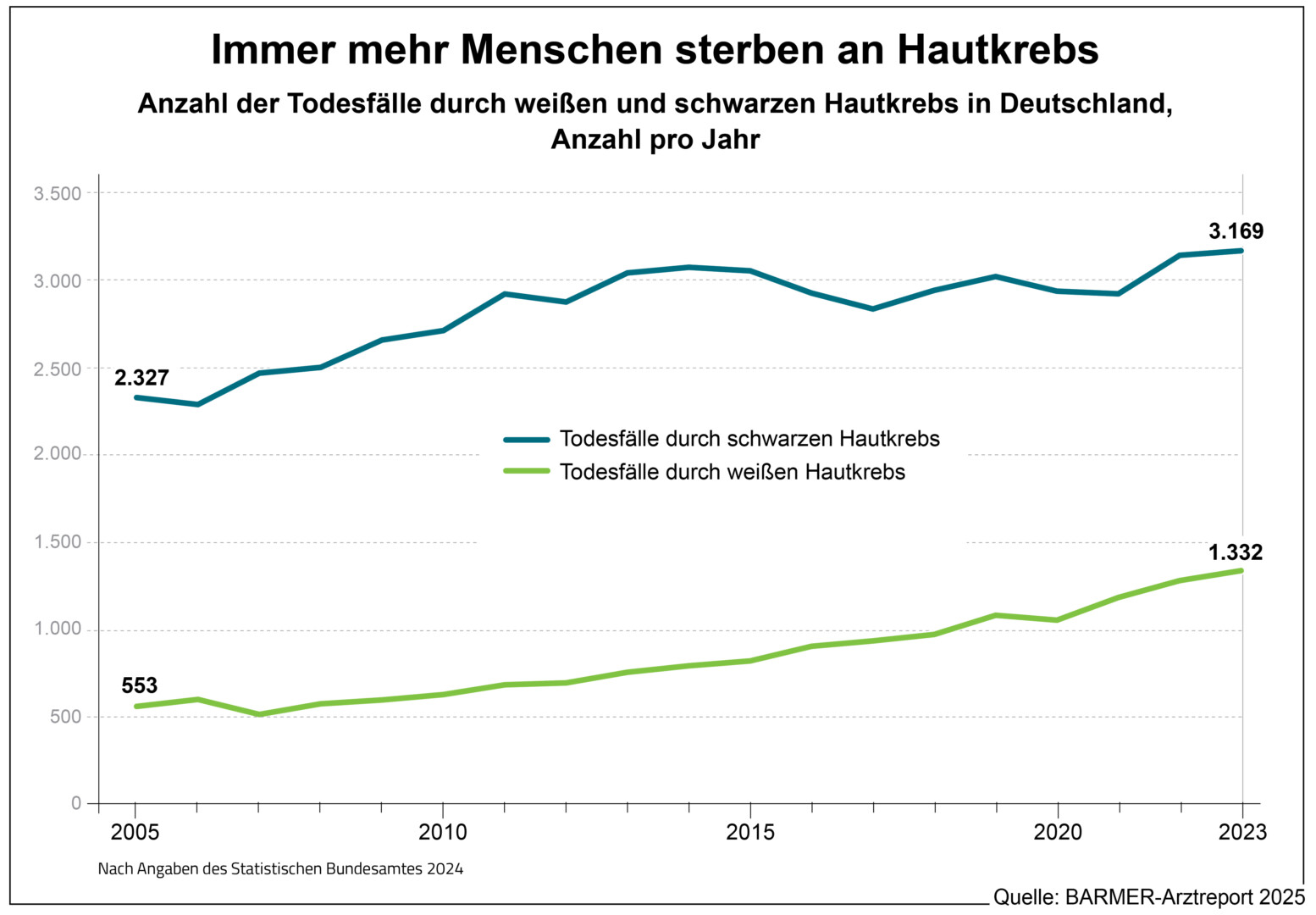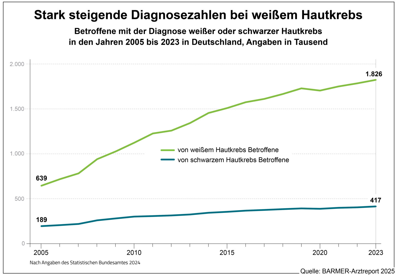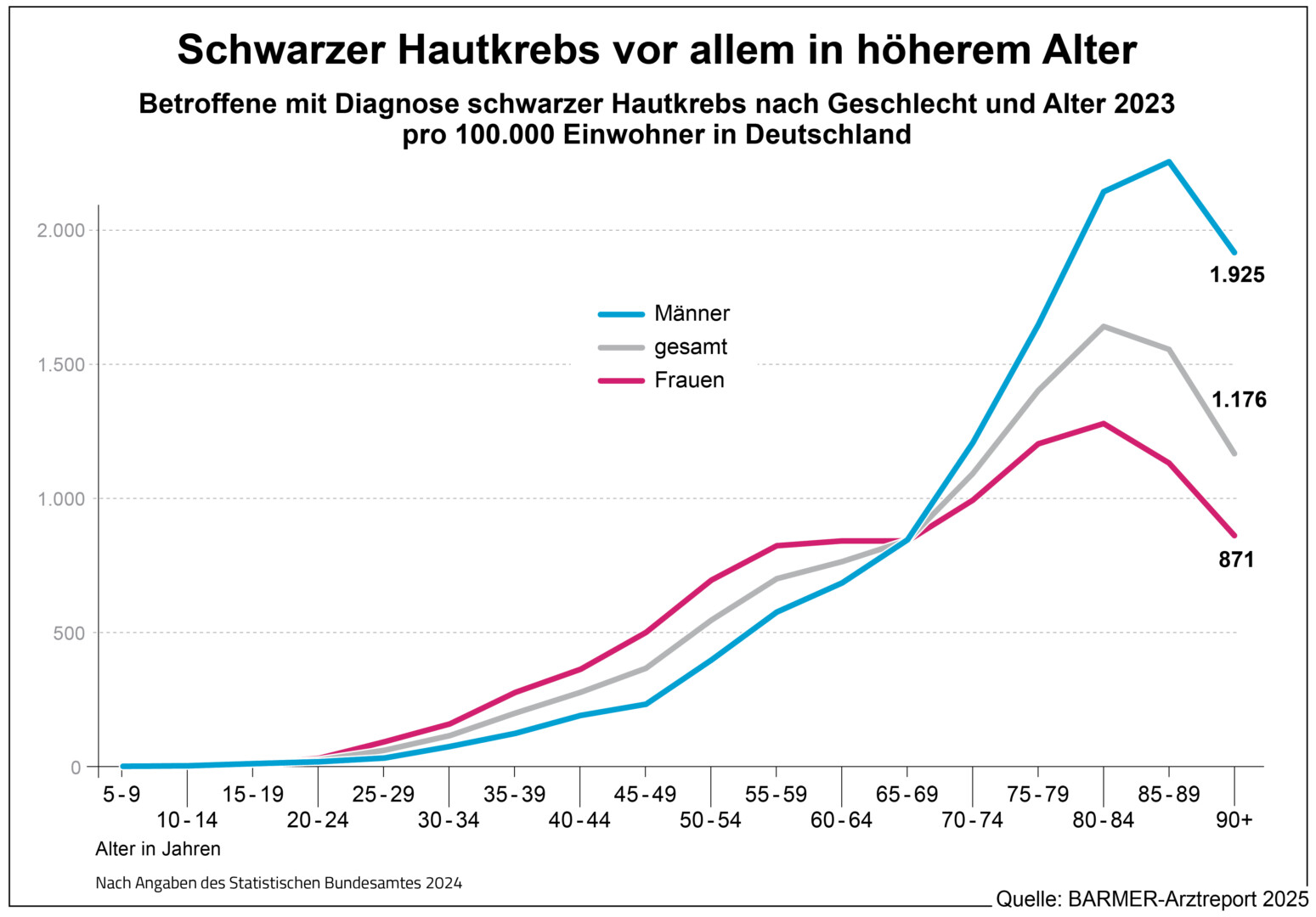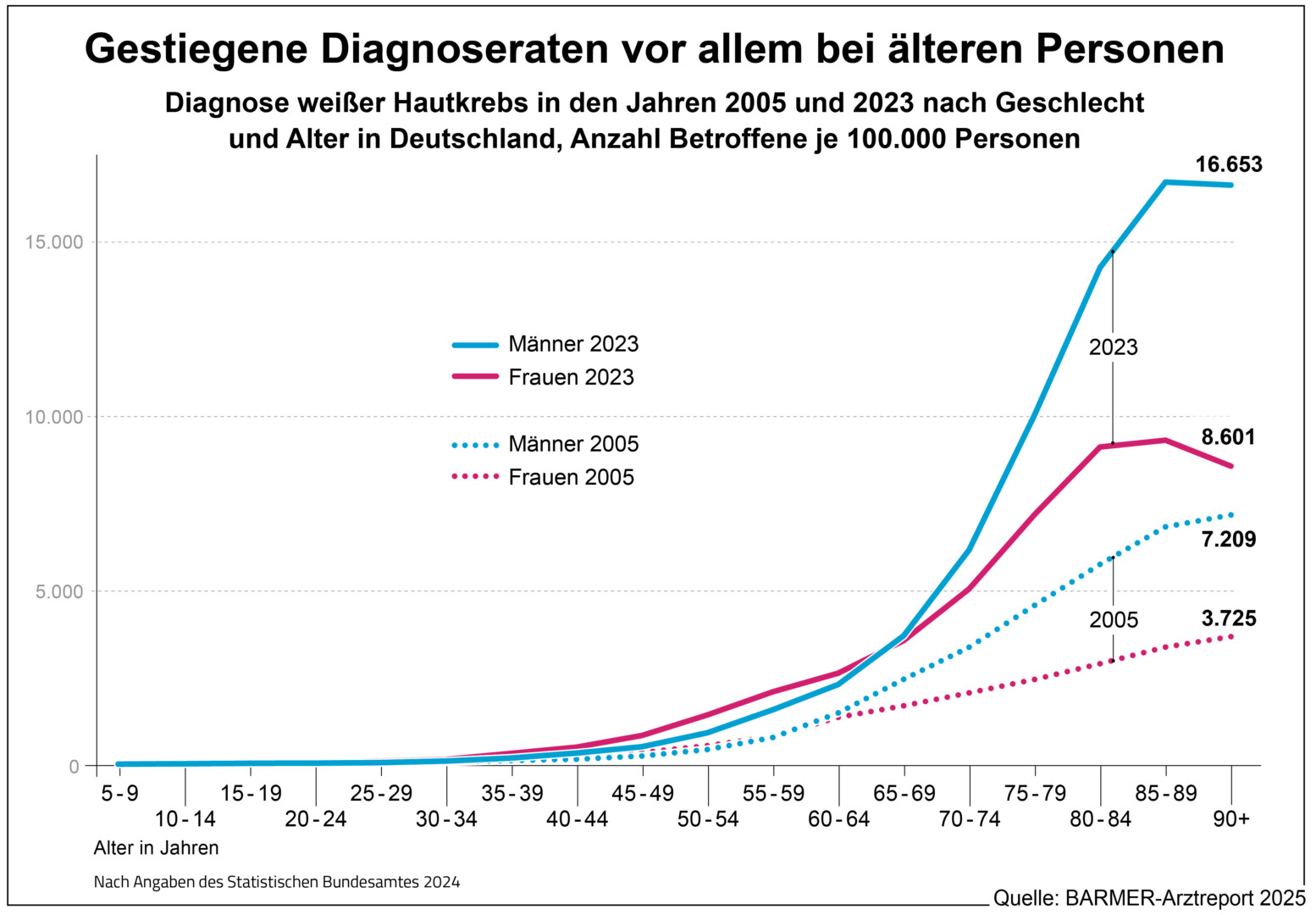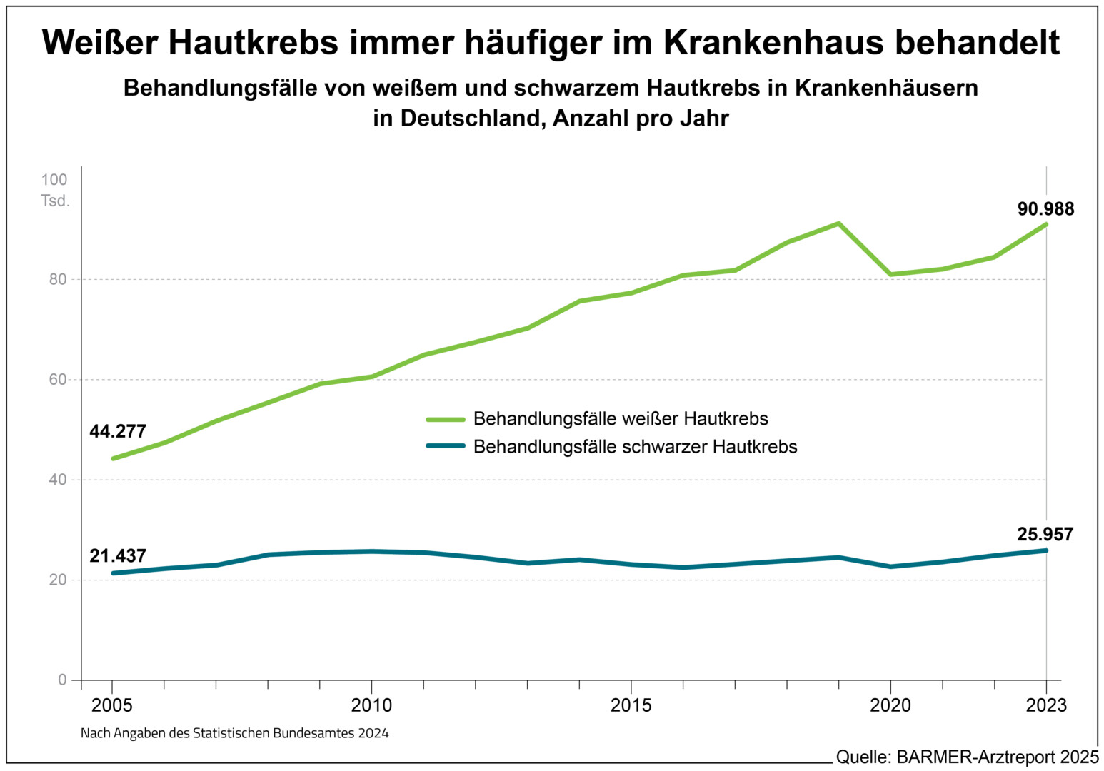 Laut Arztreport müssen immer mehr Menschen aufgrund von Hautkrebs im Krankenhaus versorgt werden. Bei schwarzem Hautkrebs ist die Zahl der Behandlungsfälle nach Angaben des Statistischen Bundesamtes in den Jahren 2005 bis 2023 von 21.437 auf 25.957 und damit um 21 Prozent gestiegen. Bei weißem Hautkrebs hingegen hat es eine Zunahme um 106 Prozent gegeben, von 44.277 auf 90.988. Hochrechnungen nach Barmer-Daten kommen im Jahr 2023 mit 26.461 und 91.265 Fällen bei schwarzem und weißem Hautkrebs auf sehr ähnliche Ergebnisse, was für die Repräsentativität der Daten spricht. „In den kommenden Jahren könnte es noch deutlich mehr Betroffene geben, das lässt sich zum Teil bereits durch die alternde Gesellschaft erklären. Es bleibt zu hoffen, dass der Anstieg durch primäre Prävention und entsprechendes Verhalten abgebremst werden kann“, so Straub.