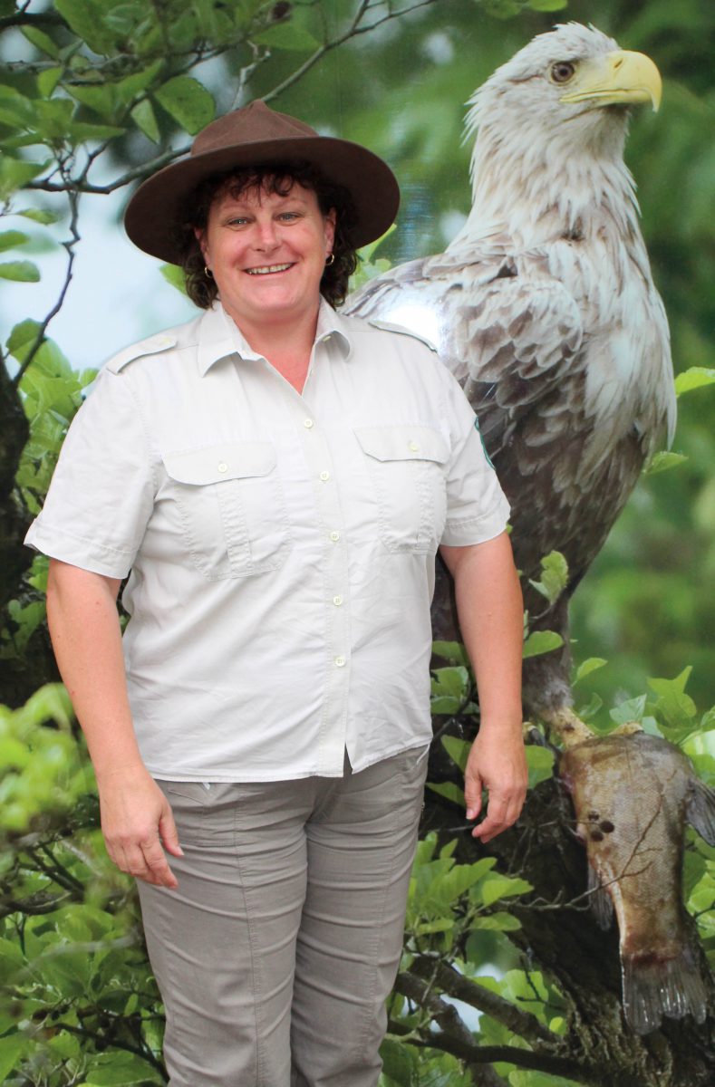 Bild: Rangerin Liane Himm vom Nationalparkamt Müritz informiert Gäste in ihrer Führung „Aufgewacht mit den Vögeln des Glücks“