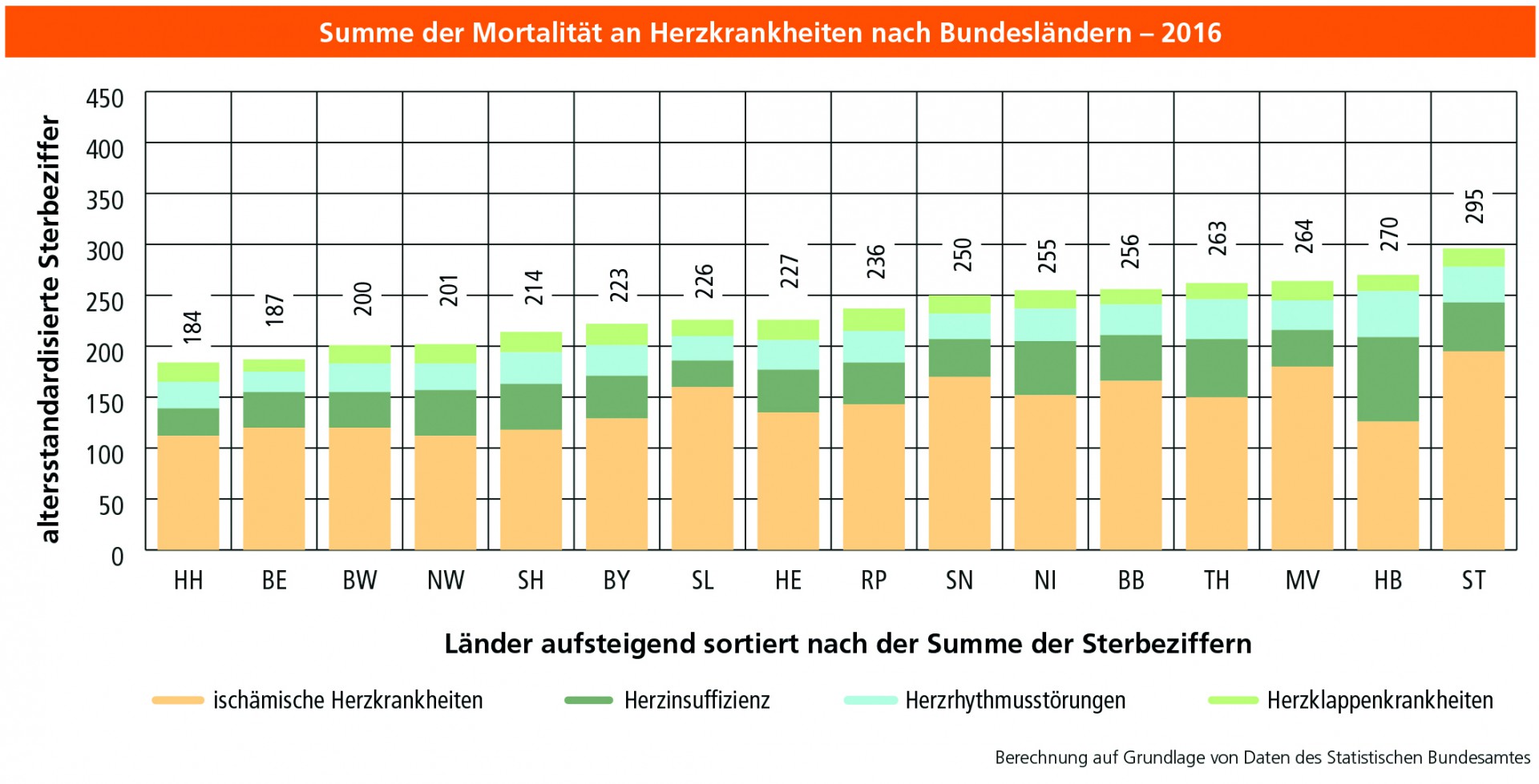 Unverändert ist die unterschiedlich hohe Sterblichkeit an Herzkrankheiten zwischen den einzelnen Bundesländern. Während die niedrigste Sterbeziffer weiterhin Hamburg mit 184 Gestorbenen pro 100.000 EW, Berlin (187) und Baden-Württemberg (200) haben, ist die Sterblichkeit am höchsten in Sachsen-Anhalt (295), Bremen (270) und Mecklenburg-Vorpommern (264).