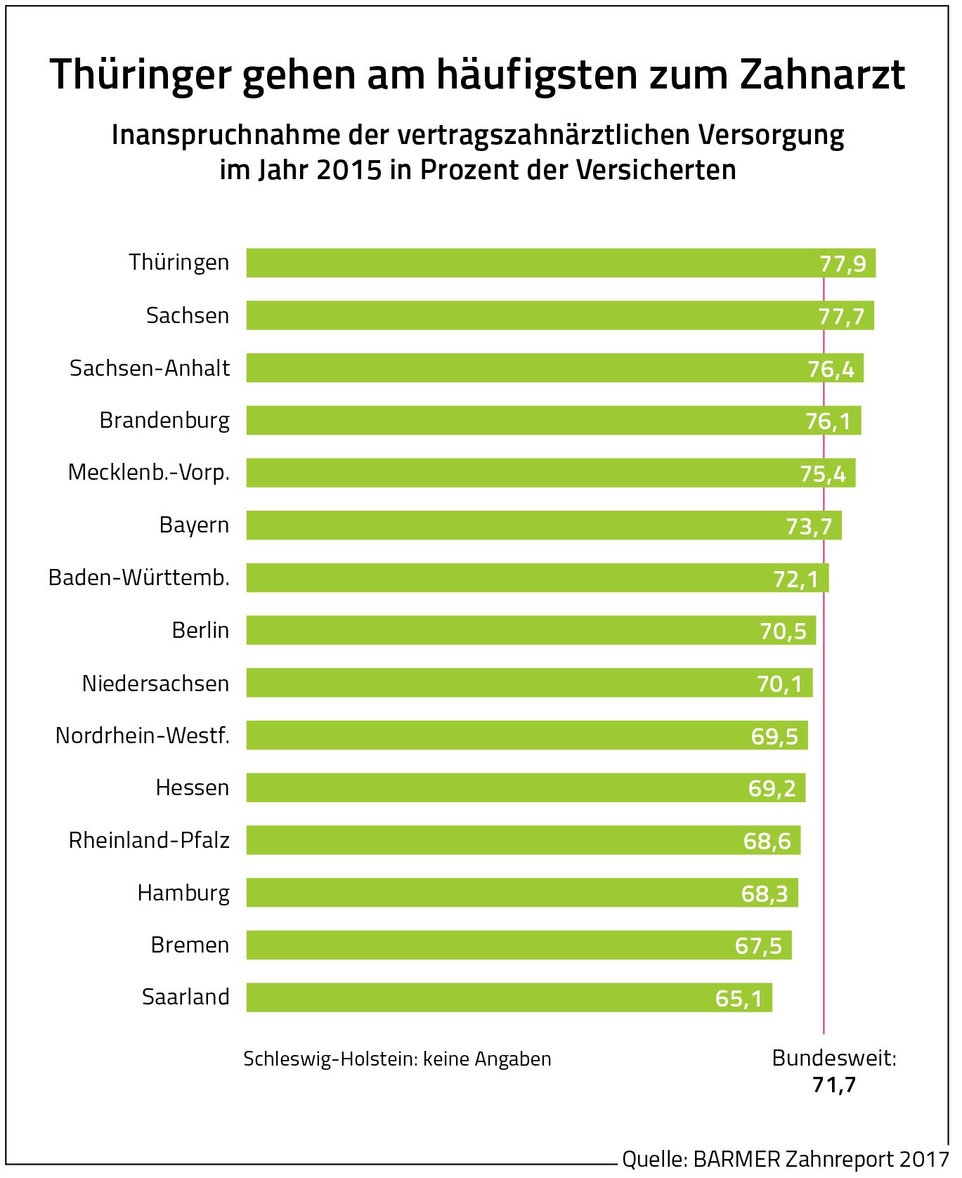 Im regionalen Vergleich gehen vor allem die Saarländer nicht gerne zum Zahnarzt. Hier nahmen im Jahr 2015 nur 65,1 Prozent einen Zahnarzttermin wahr. Ähnlich sah es in Bremen (67,5 Prozent), Hamburg (68,3 Prozent) und Rheinland-Pfalz (68,6 Prozent) aus. Die Thüringer nehmen hingegen die Spitzenposition ein. Hier waren es 77,9 Prozent, die zum Zahnarzt gegangen sind, gefolgt von den Bürgern aus Sachsen (77,7 Prozent), Sachsen-Anhalt (76,4 Prozent), Brandenburg (76,1 Prozent) und Mecklenburg-Vorpommern (75,4 Prozent).