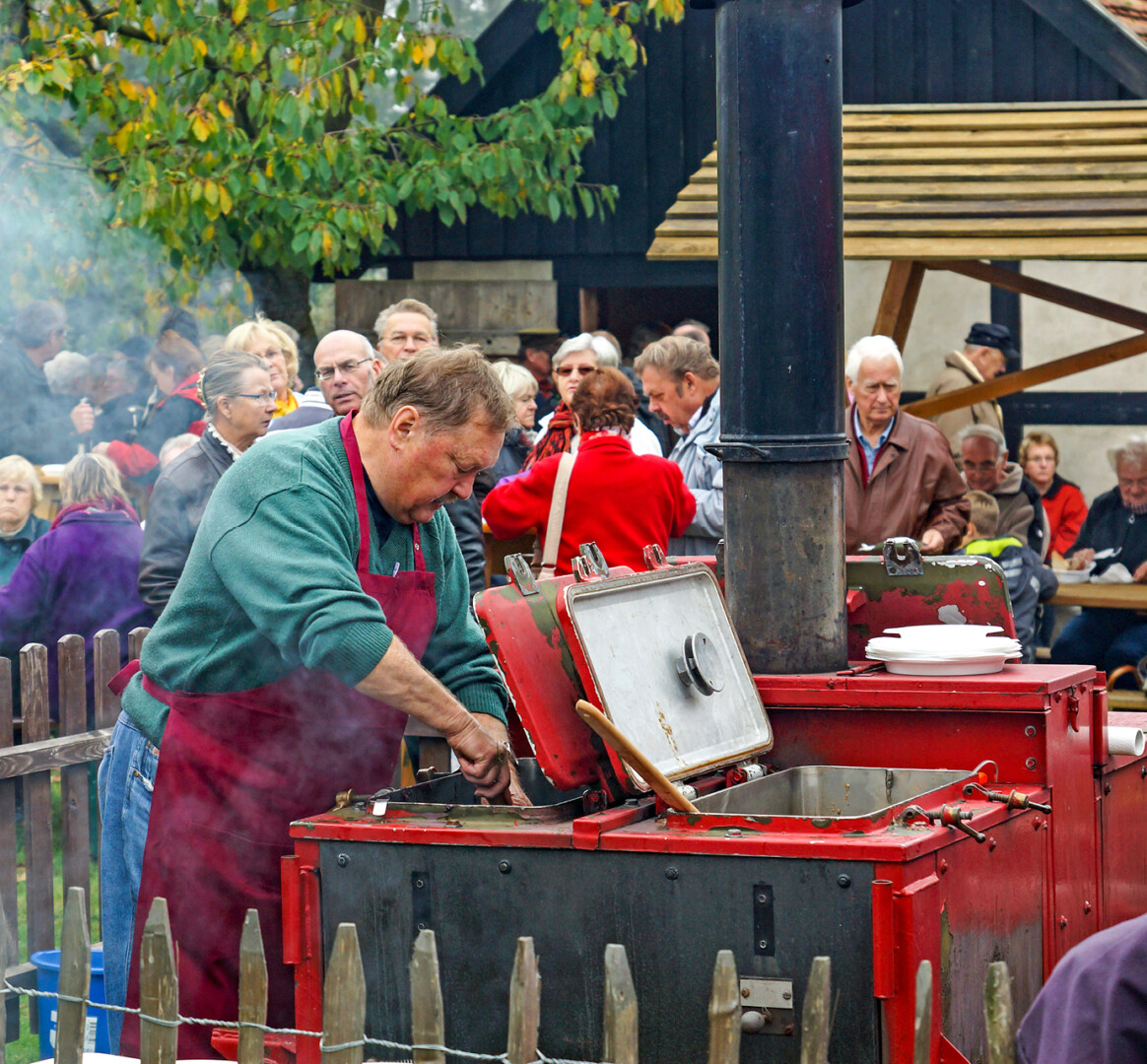 Aus dampfenden Kesseln und Pfannen werden Eisbein, Grützwurst und Wellfleisch serviert. Aber auch für alle, die es nicht nur deftig mögen, hat das Team des Agroneums zusätzlich viel Leckeres vorbereitet. Frisches Sauerteigbrot aus dem Steinbackofen, hausgemachten Blechkuchen und die große Vielfalt der Fruchtaufstriche aus der Museumsküche kann man an diesem Tag vor Ort genießen oder auch zum Mitnehmen einkaufen.