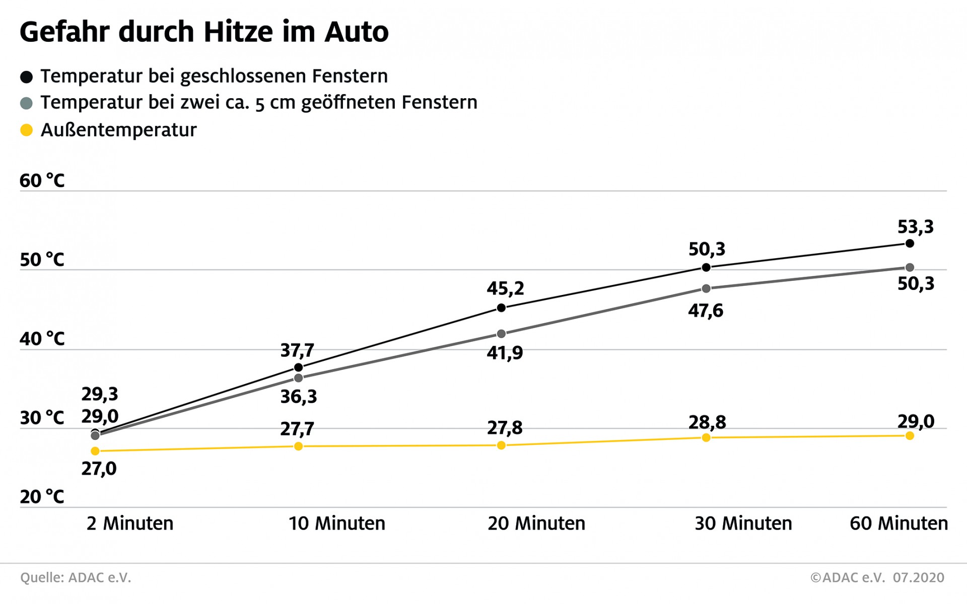 Selbst leicht geöffnete Fenster machen keinen Unterschied. Bei einer Untersuchung baugleicher Fahrzeuge mit unterschiedlichen Fensteröffnungen bei 28 Grad Celsius Außentemperatur ergab sich nahezu dasselbe Bild: Binnen kürzester Zeit erreichte die Temperatur im Wageninneren bedrohliche Werte. Blieben die Fenster geschlossen, wurden nach zehn Minuten 38 Grad und nach 20 Minuten sogar 45 Grad gemessen. Waren zwei Fenster leicht geöffnet, erreichten die Werte immerhin noch 36 bzw. 42 Grad Celsius (nach zehn bzw. 20 Minuten).