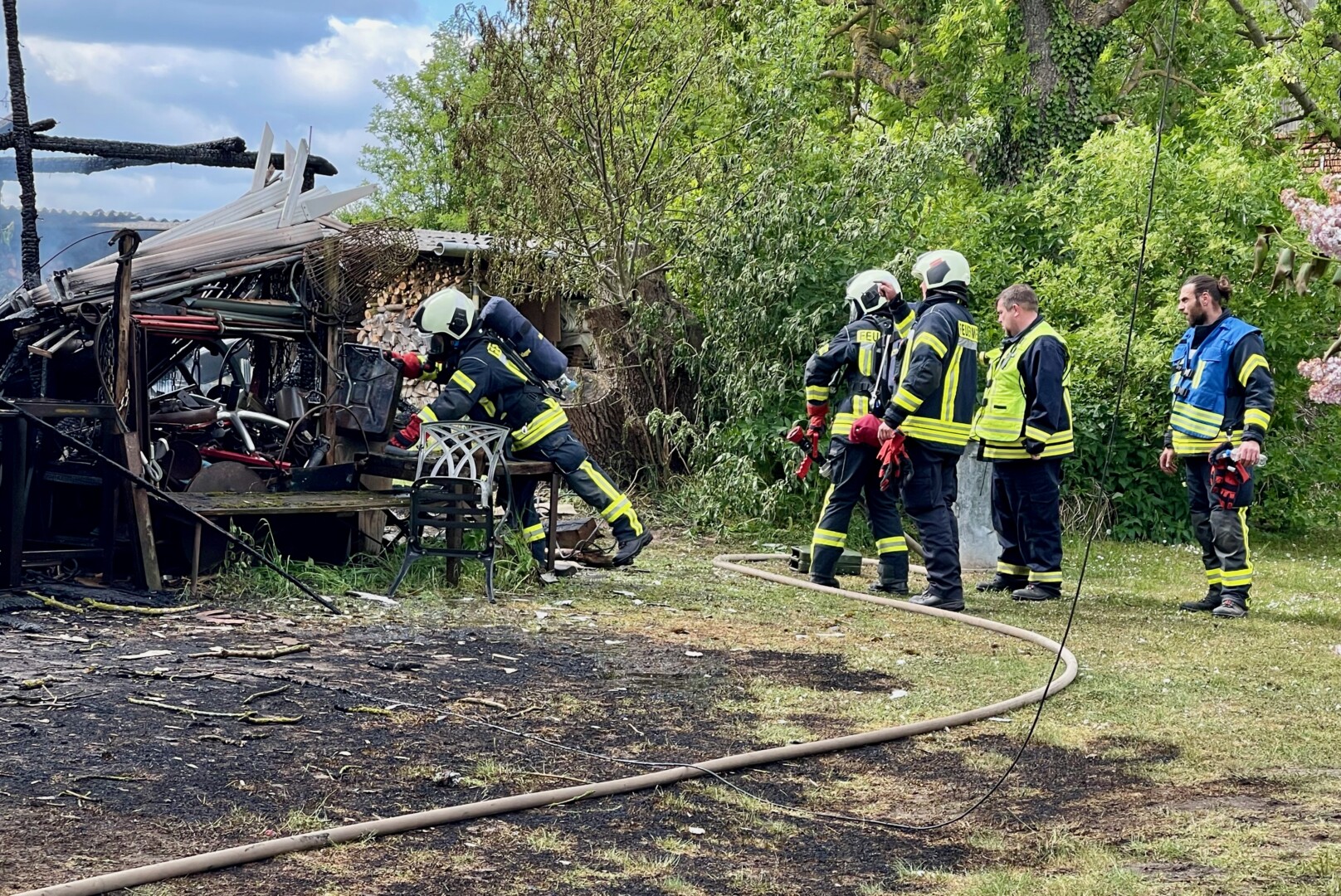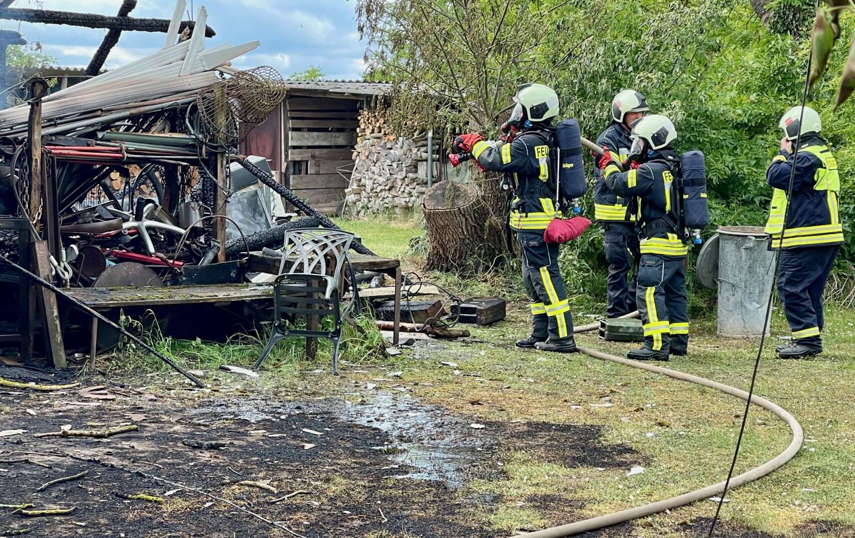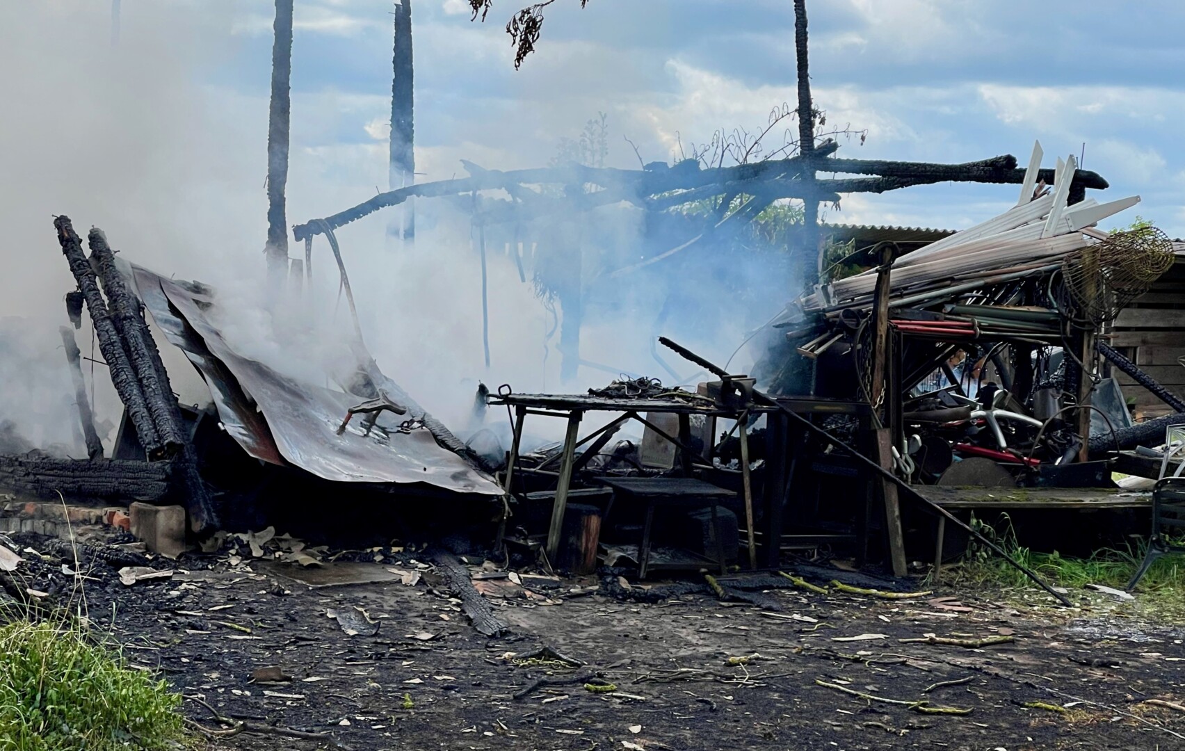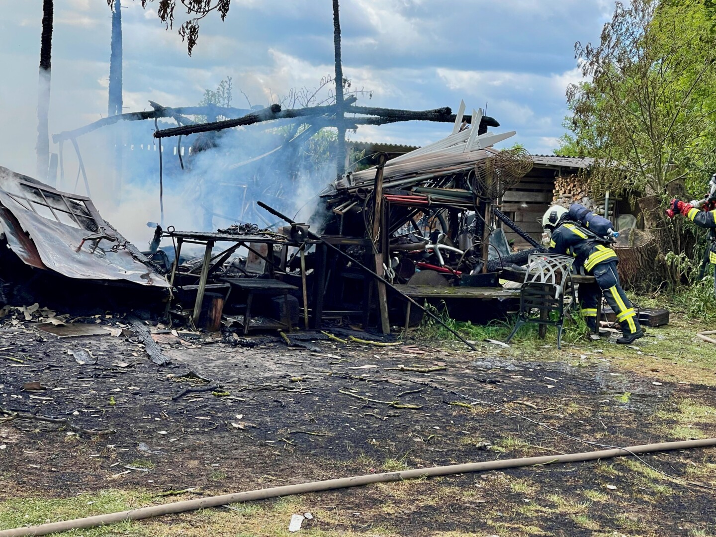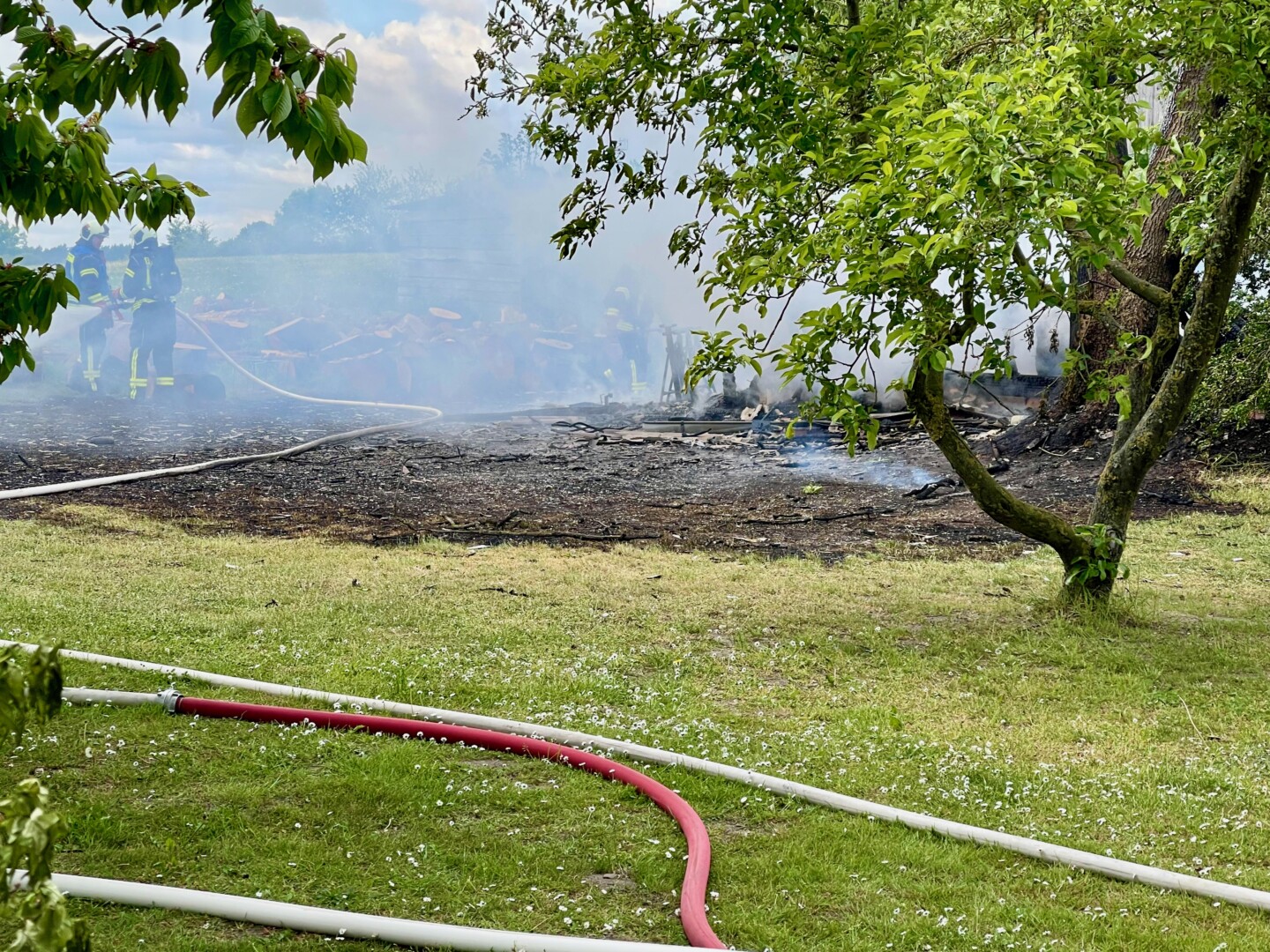 Da war nichts mehr zu retten: In Lehsten bei Möllenhagen ist heute Nachmittag auf einem Privatgrundstück eine Art Hobby-Werkstatt komplett abgebrannt. Nach derzeitiger Kenntnis ist von einem technischen Defekt auszugehen. Feuerwehr und Polizei sind im Einsatz. Die Durchfahrtsstraße ist daher aktuell noch gesperrt. Neben der Werkstatt auf dem privaten Gelände, die samt Inhalten ausbrannte, war auch ein Baum vom Feuer betroffen. Die Polizei schätzt den Schaden auf etwa 30.000 Euro. Mehrere Feuerwehren der Region sind alarmiert worden. Die Windrichtung war zum Glück so günstig, dass nebenstehende Gebäude nicht in Mitleidenschaft gezogen wurden. Verletzt wurde nach aktuellem Stand niemand.