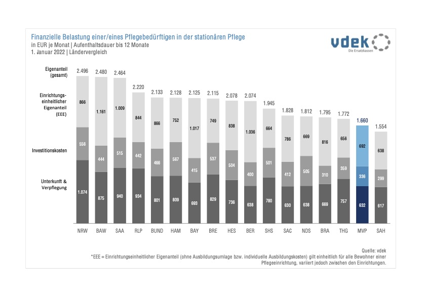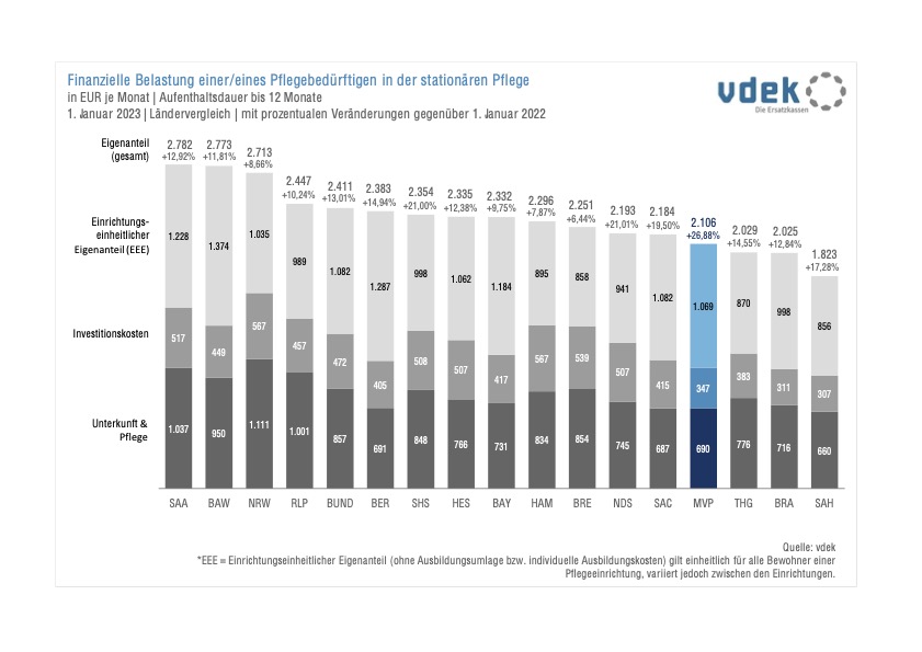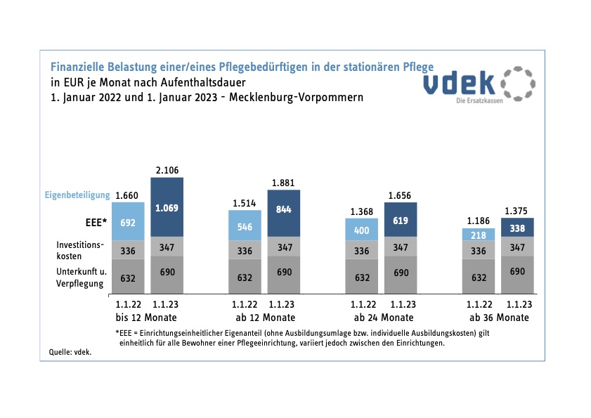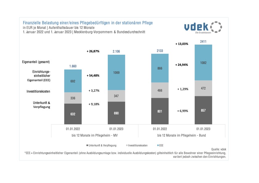 Schon in der Vergangenheit sind die durch die Pflegeheimbewohner in Mecklenburg-Vorpommern zu tragenden Eigenanteile kontinuierlich angestiegen. Diese Tendenz setzte sich 2022 spürbar fort. Gingen die Beträge im Bundesdurchschnitt um gut 13 Prozent nach oben, waren es in Mecklenburg-Vorpommern sogar 27 Prozent, wie aktuelle Zahlen des Verbands der Ersatzkassen (vdek) zeigen. Betroffen sind von diesem Anstieg diejenigen, die weniger als zwölf Monate im Pflegeheim leben. Sie müssen in MV nun monatlich durchschnittlich 2.106 Euro aus eigener Tasche zahlen. Ein Plus von 446 Euro.