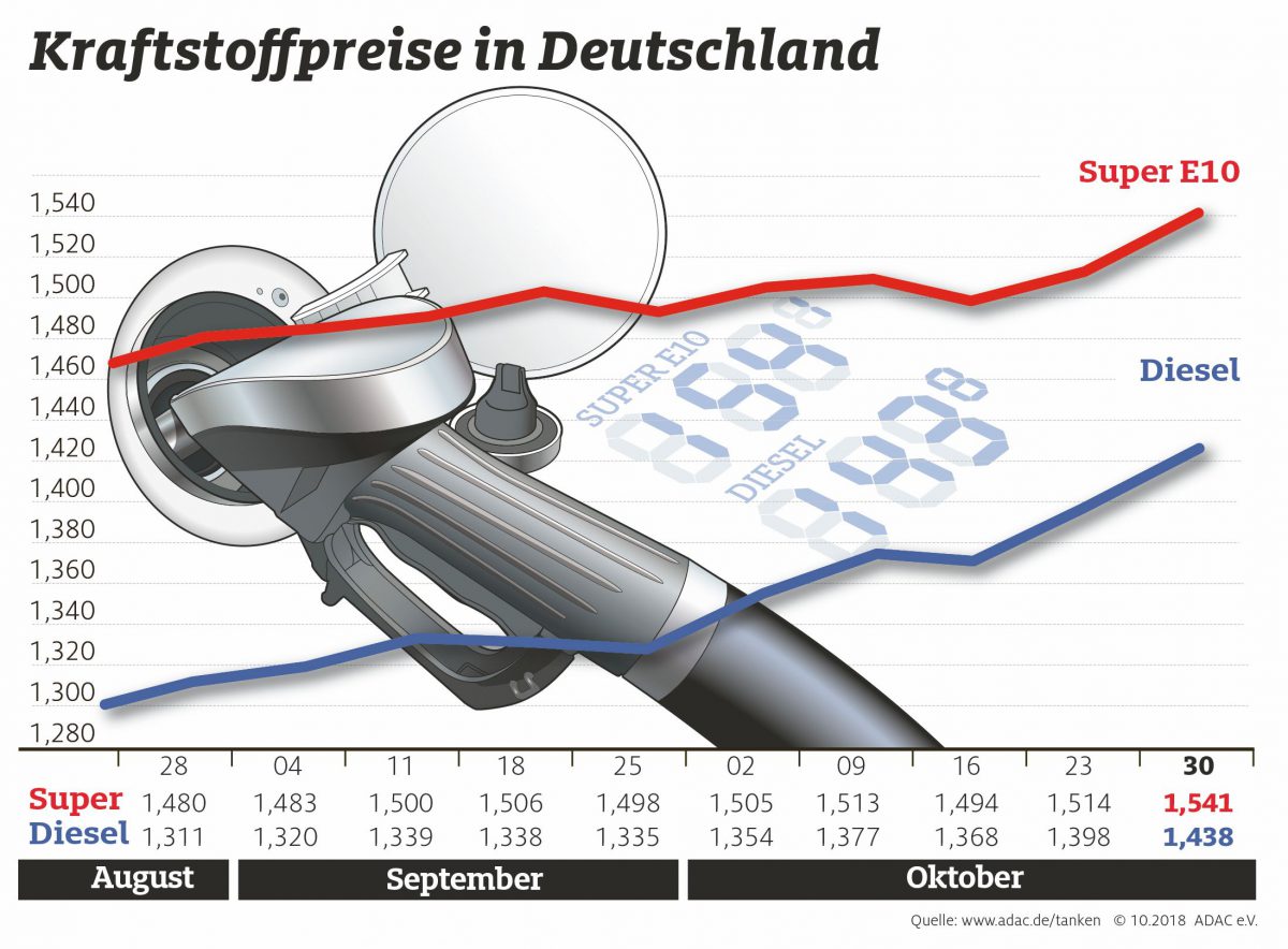 Die Preise an den Zapfsäulen kennen derzeit nur eine Richtung: nach oben. Super E10 verteuerte sich nach Angaben des ADAC im Vergleich zur Vorwoche um 2,7 Cent auf 1,541 Euro pro Liter. Für Diesel müssen Autofahrer sogar 4,0 Cent mehr bezahlen. Ein Liter kostet nun 1,438 Euro. Betrachtet man die Entwicklung der vergangenen beiden Wochen, summiert sich der Preissprung im Bundesdurchschnitt auf 4,7 Cent bei Super E10 und 7,0 Cent bei Diesel.