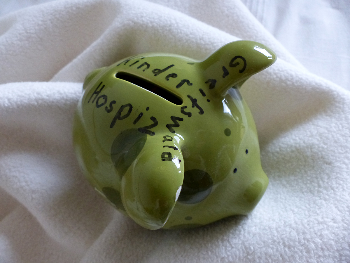Bei zwei kulinarischen Abenden auf dem Hof Sorgenlos hat Andreas den Tafelgästen von der Aktion erzählt und ein Spendenschweinchen aufgestellt.Dieses mit 105 Euro befüllte Schweinchen wird morgen in der Gärtnerei Wöllert abgeben. Aber nicht nur das – mit dabei ist auch ein Gutschein für einen einwöchigen Aufenthalt auf dem Hof Sorgenlos für ein Hospiz-Kind mit Familie.