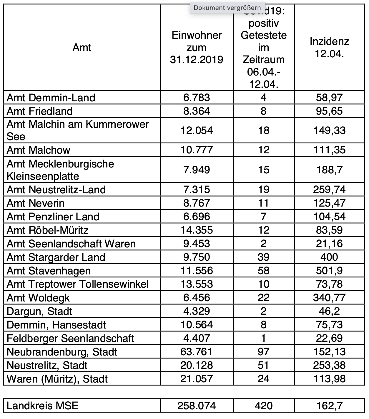 Die höchste Inzidenz im Landkreis Mecklenburgische Seenplatte meldet das Amt Stavenhagen mit 501,9. In Waren liegt sie inzwischen ebenfalls deutlich über 100.