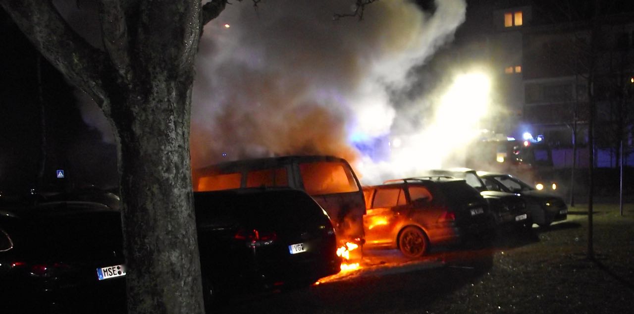 In Stavenhagen sind durch ein Feuer in der letzten Nacht fünf Fahrzeuge arg in Mitleidenschaft gezogen worden. Als die Feuerwehr nach einem Hinweis einer Anwohnerin eintraf, brannten bereits zwei Fahrzeuge. Das Feuer ging offenbar von einem Transporter T4 aus, griff von dort auf einen Golf über und beschädigte einen Opel. Herumfliegende Teile von den brennenden Fahrzeugen beschädigten zudem zwei weitere Pkw.