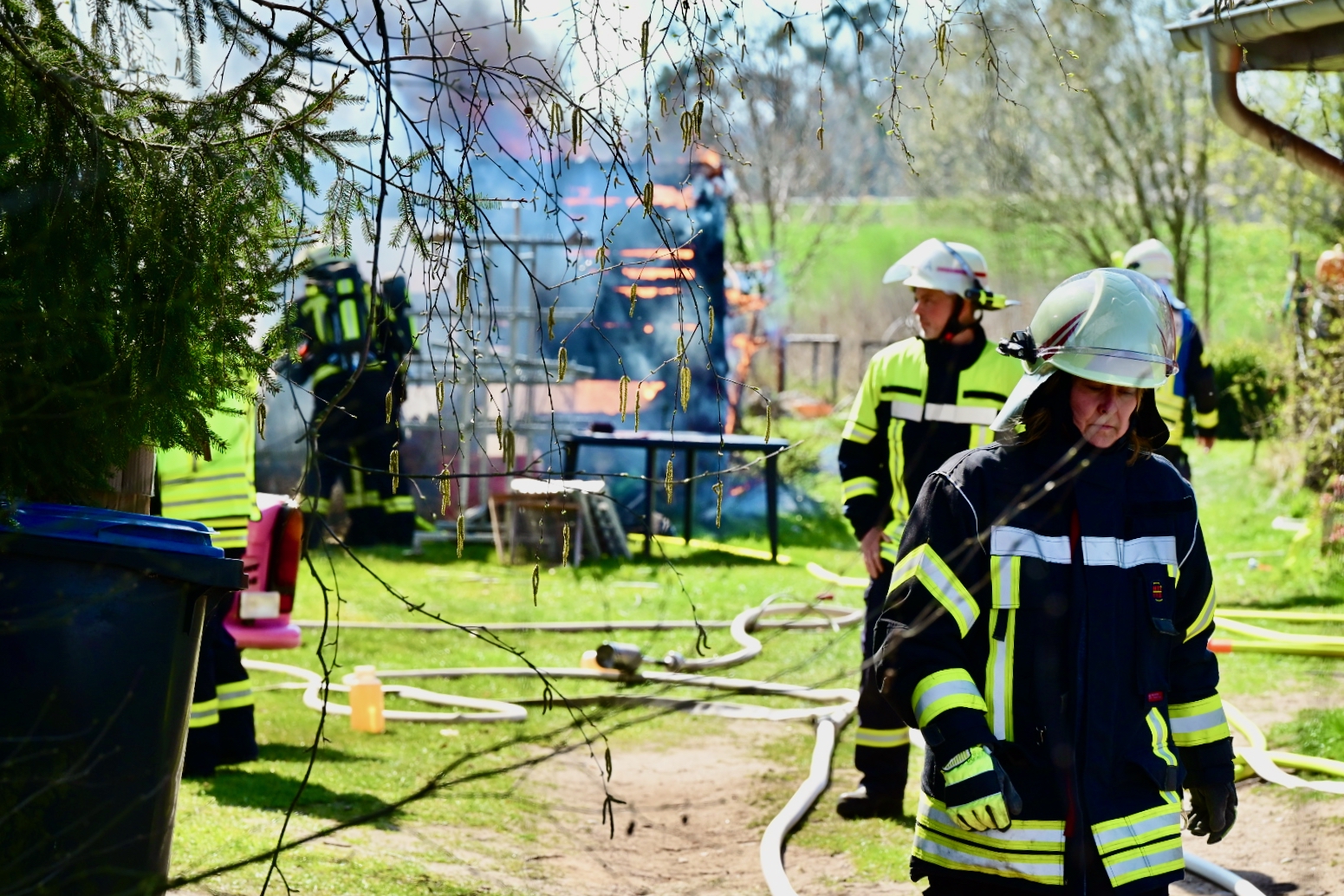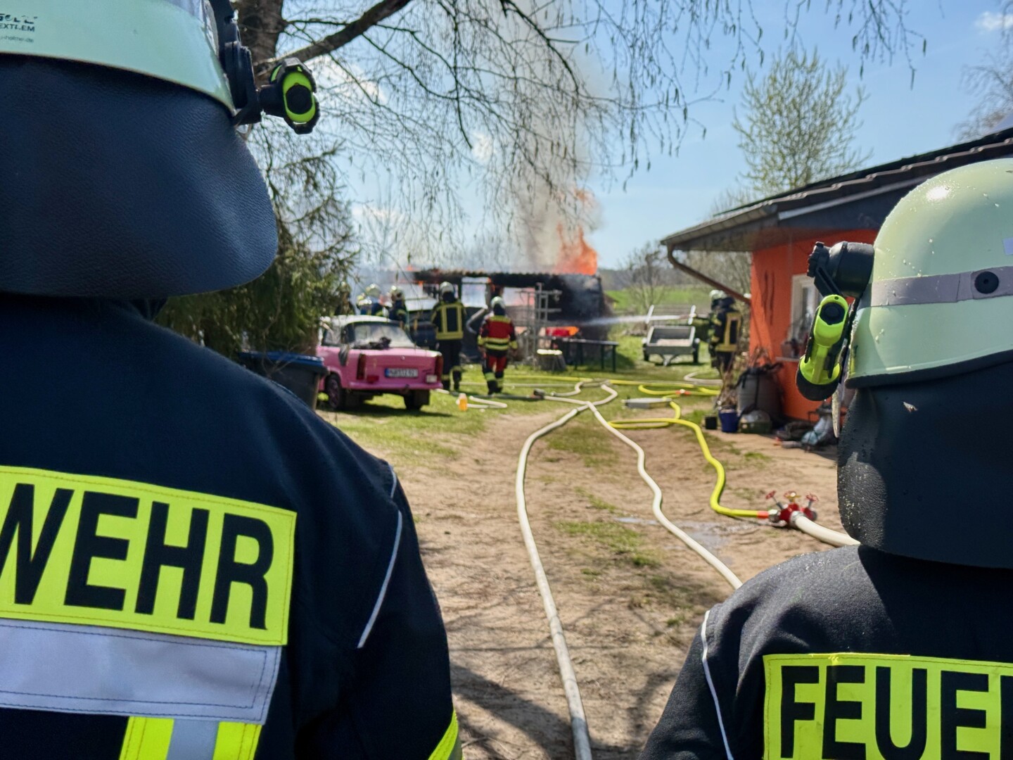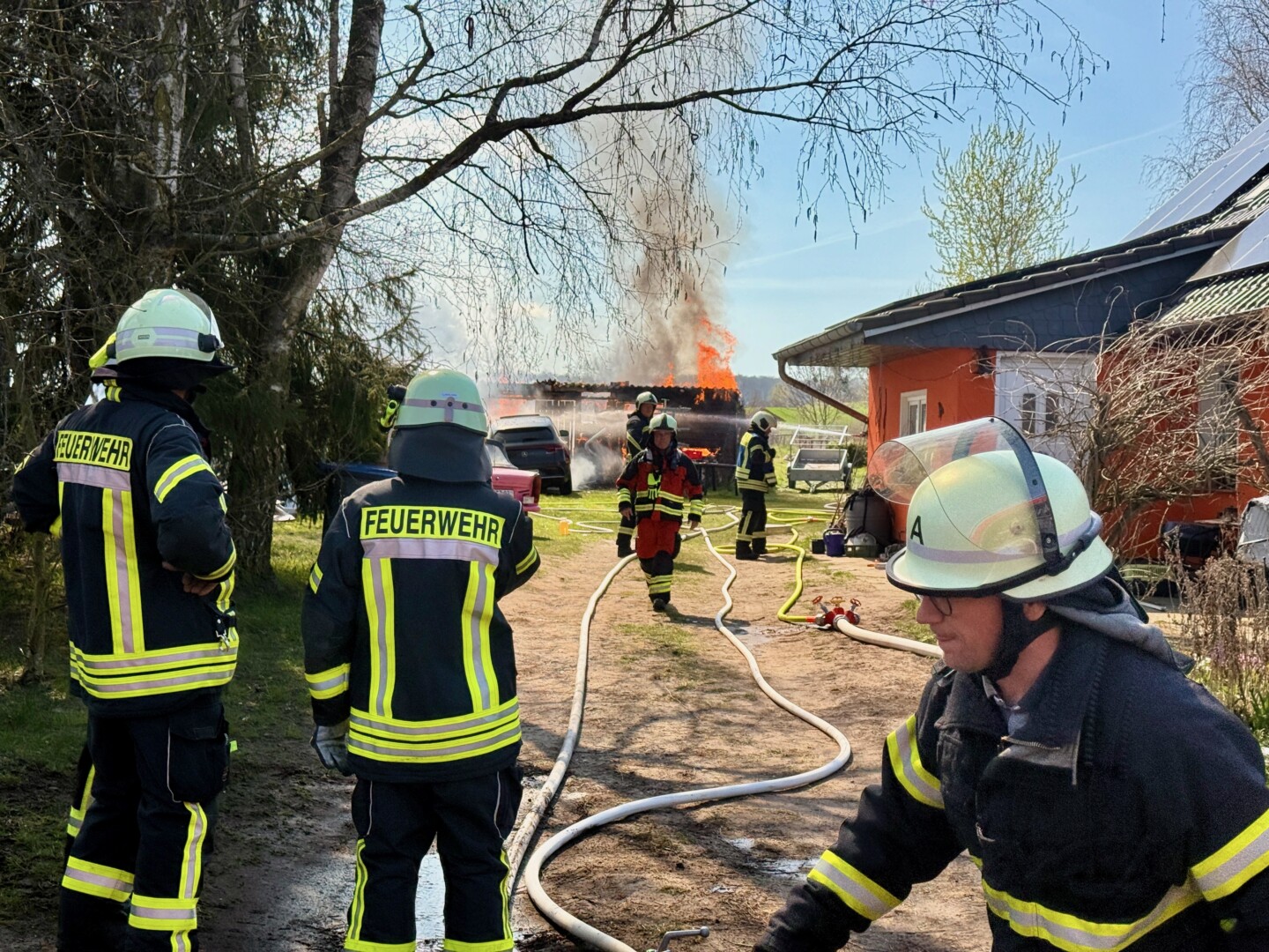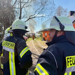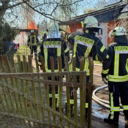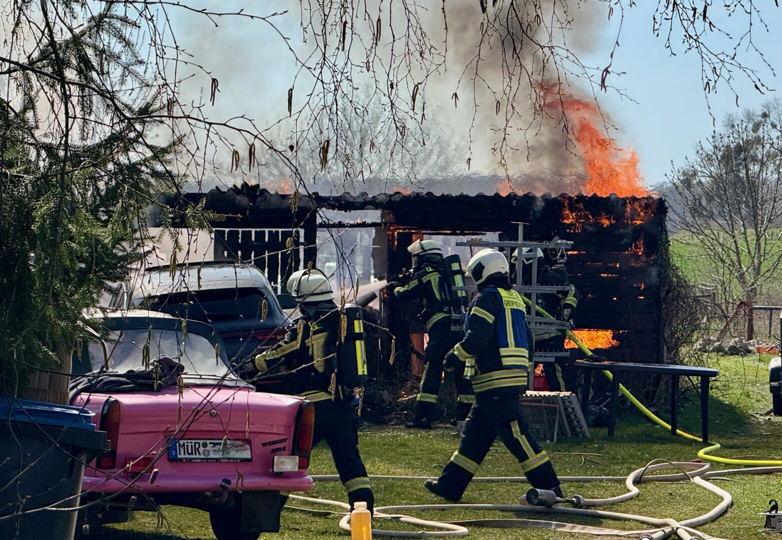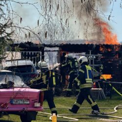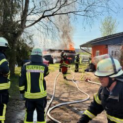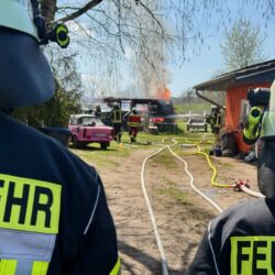 Der schwarze Rauch war schon von Waren aus zu sehen: Mehrere Wehren der Region eilten heute Mittag nach Alt Schönau in den Waldweg. Dort stand ein größerer Schuppen in Flammen. Und der hatte es in sich, denn er war gut „gefüllt“. Zudem stand vor dem Schuppen ein E-Mercedes, dahinter ein großer Gas-Tank. Auf dem Schuppen Asbest, was immer wieder mit lautem Knallen zerfiel. Das E-Auto dürfte nicht mehr zu gebrauchen sein, auch wenn „nur“ der Motorraum von dem Feuer betroffen war.
