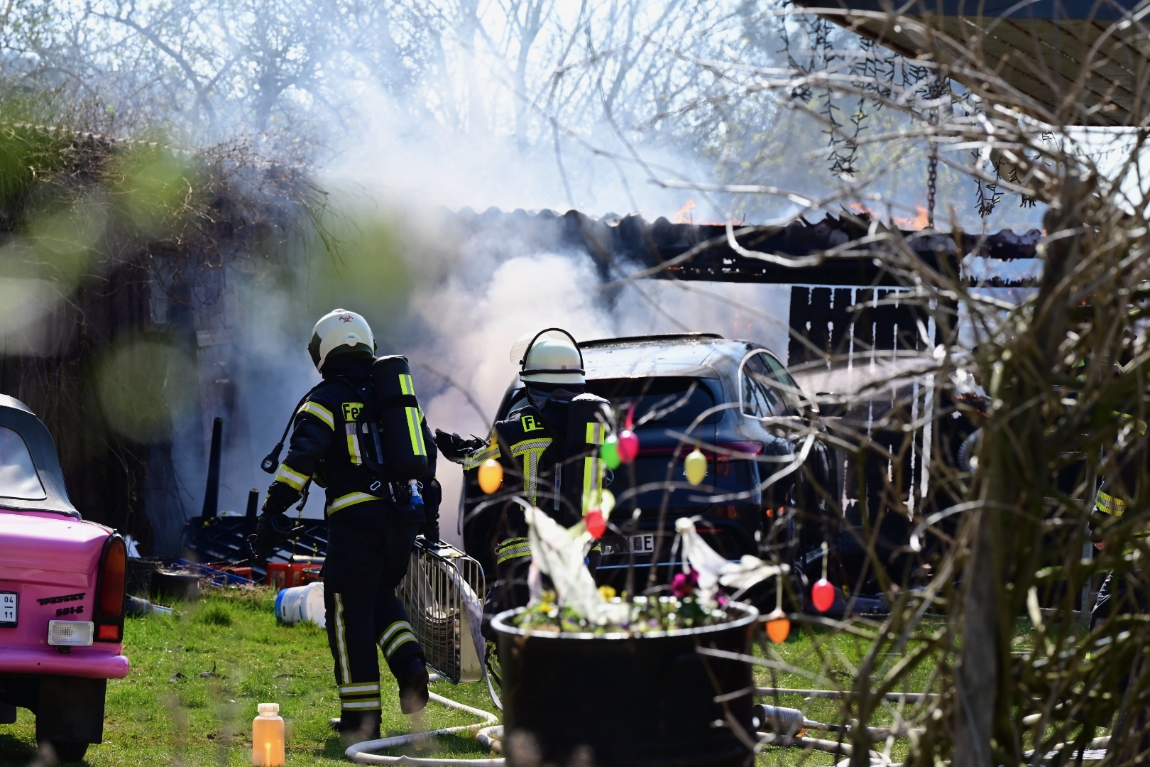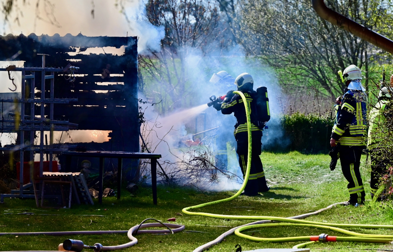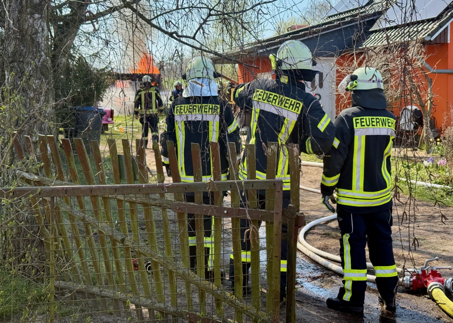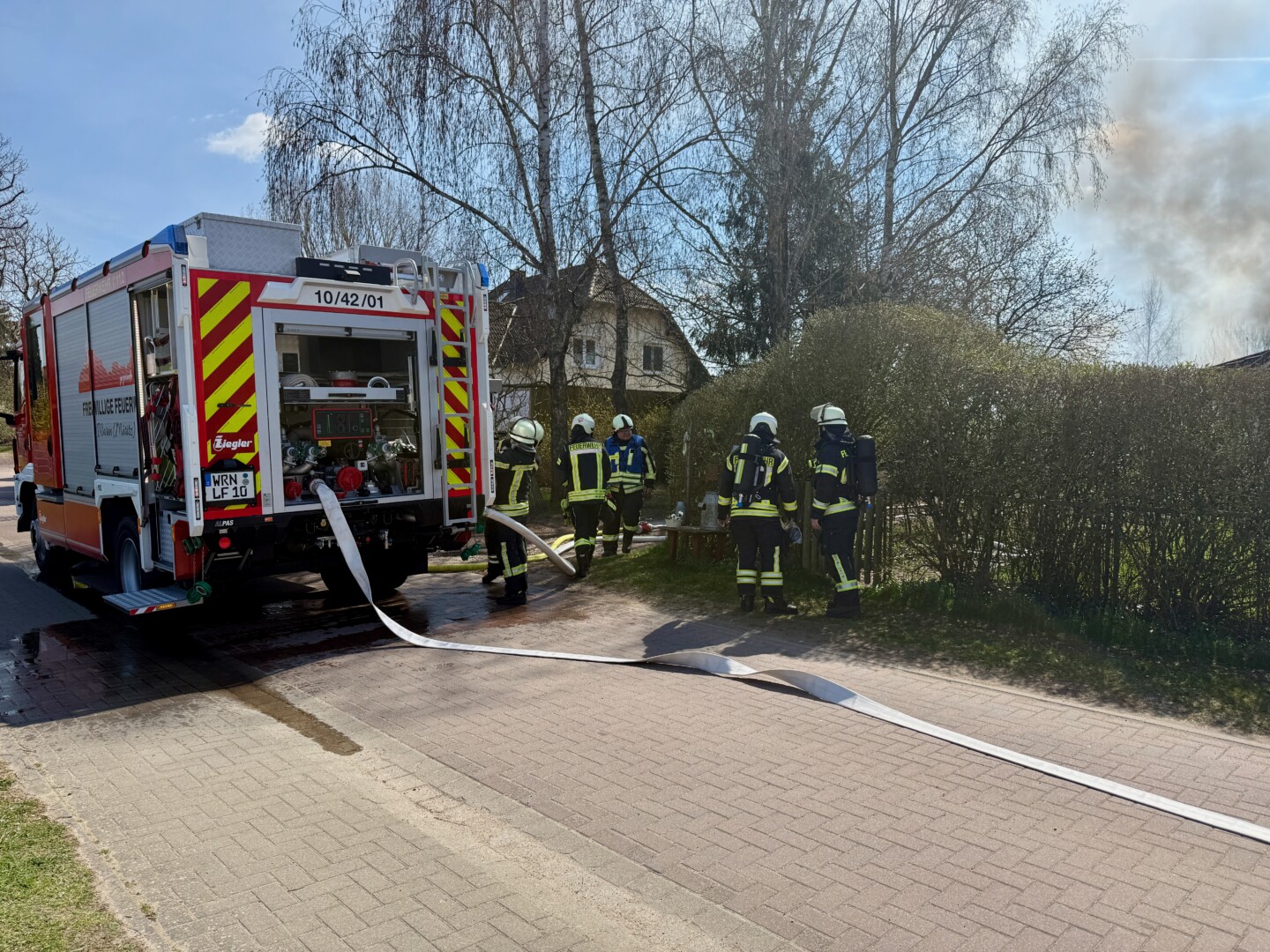 Der schwarze Rauch war schon von Waren aus zu sehen: Mehrere Wehren der Region eilten heute Mittag nach Alt Schönau in den Waldweg. Dort stand ein größerer Schuppen in Flammen. Und der hatte es in sich, denn er war gut „gefüllt“. Zudem stand vor dem Schuppen ein E-Mercedes, dahinter ein großer Gas-Tank. Auf dem Schuppen Asbest, was immer wieder mit lautem Knallen zerfiel. Das E-Auto dürfte nicht mehr zu gebrauchen sein, auch wenn „nur“ der Motorraum von dem Feuer betroffen war.