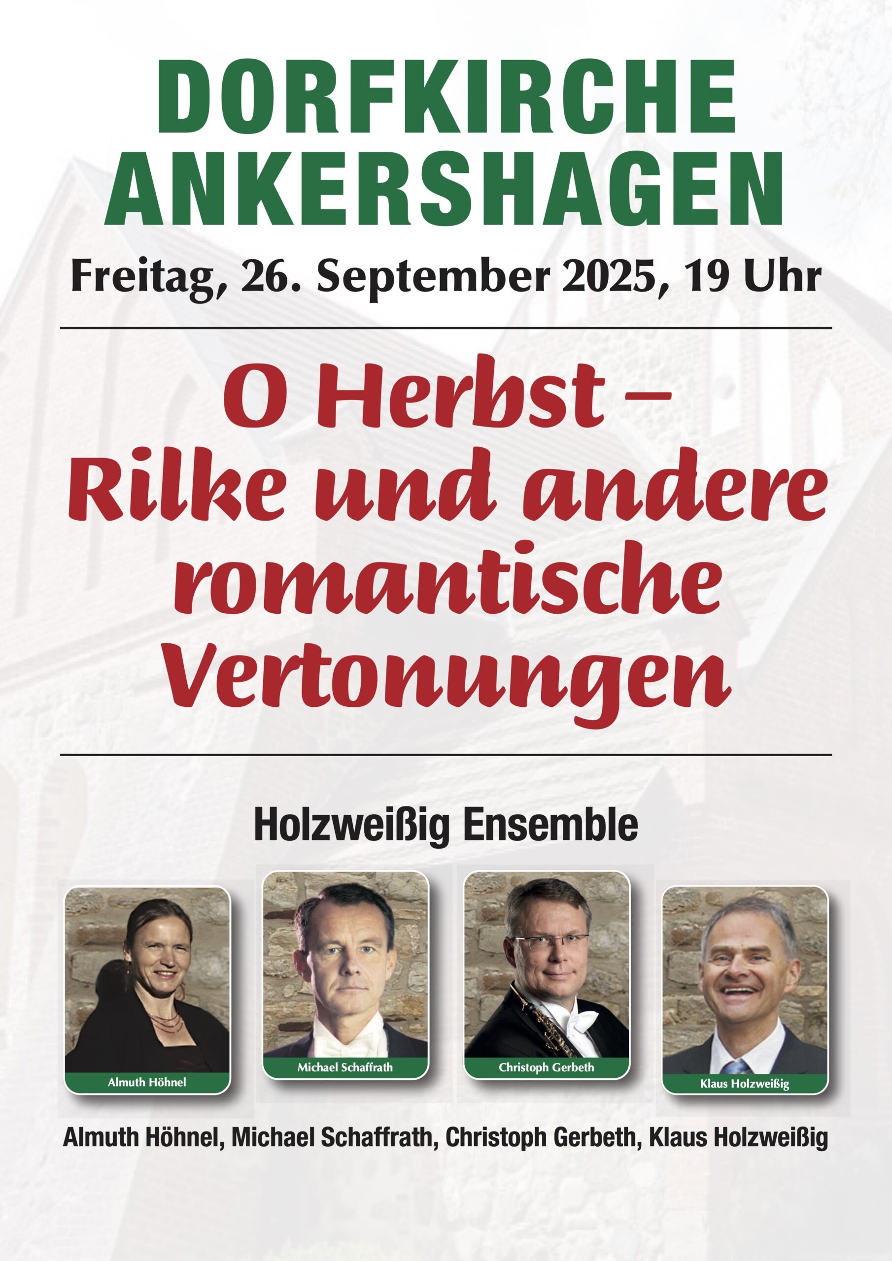 Das Holzweißig-Ensemble aus Dresden ist am Freitag, 26. September , ab 19 Uhr in der Kirche Ankershagen zu Gast. Unter dem Titel „O Herbst – Rilke und andere romantische Vertonungen“ erklingen Werke von Telemann, Britten, Bach, Romantik-Vertonungen von Rilke, Storm und Ringelnatz. Es musizieren Almuth Höhnel (Sopran), Michael Schaffrath (Tenor), Christoph Gerbeth (Oboe) und Klaus Holzweißig (Continuo).