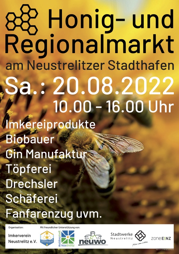 Nach dem großen Zuspruch im vergangenen Jahr hat sich der Imkerverein Neustrelitz entschlossen, auch 2022 einen Honig- und Regionalmarkt zu organisieren. Er findet in Zusammenarbeit mit der Stadt Neustrelitz rings um den Hafen am kommenden Sonnabend, 20. August, in der Zeit von 10 bis 16 Uhr statt. Imker und Bienenhalter aus Neustrelitz und Umgebung werden nicht nur unterschiedlichste Honigsorten anbieten, sondern sie geben natürlich auch gern Auskunft zu allem, was die Bienen und die Imkerei betrifft.