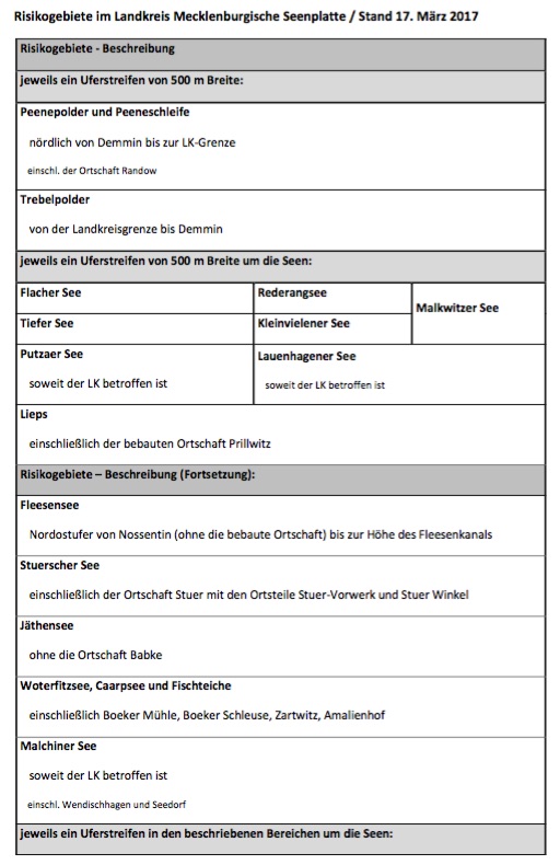 Endlich auch ohne Antrag: Ab Mitternacht gilt die wegen der Vogelgrippe verhängte Stallpflicht nur noch in so genannten Risikogebieten. Das sind Gebiete in der Nähe von Vogelrastgebieten und bestimmten Wasserflächen. Im Landkreis Mecklenburgische Seenplatte betrifft das einige Uferbereiche von Seen, bestimmte Abschnitt an Peene und Trebel und Regionen mit starkem Vogelzug. Die Liste und eine entsprechende Karte gibt es hier: