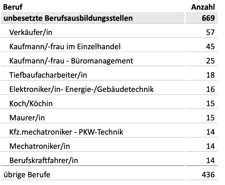 Freie Ausbildungsstellen gibt es noch in fast alle Branchen. Am meisten suchen wir für die Berufe (Juni-Daten 2023):