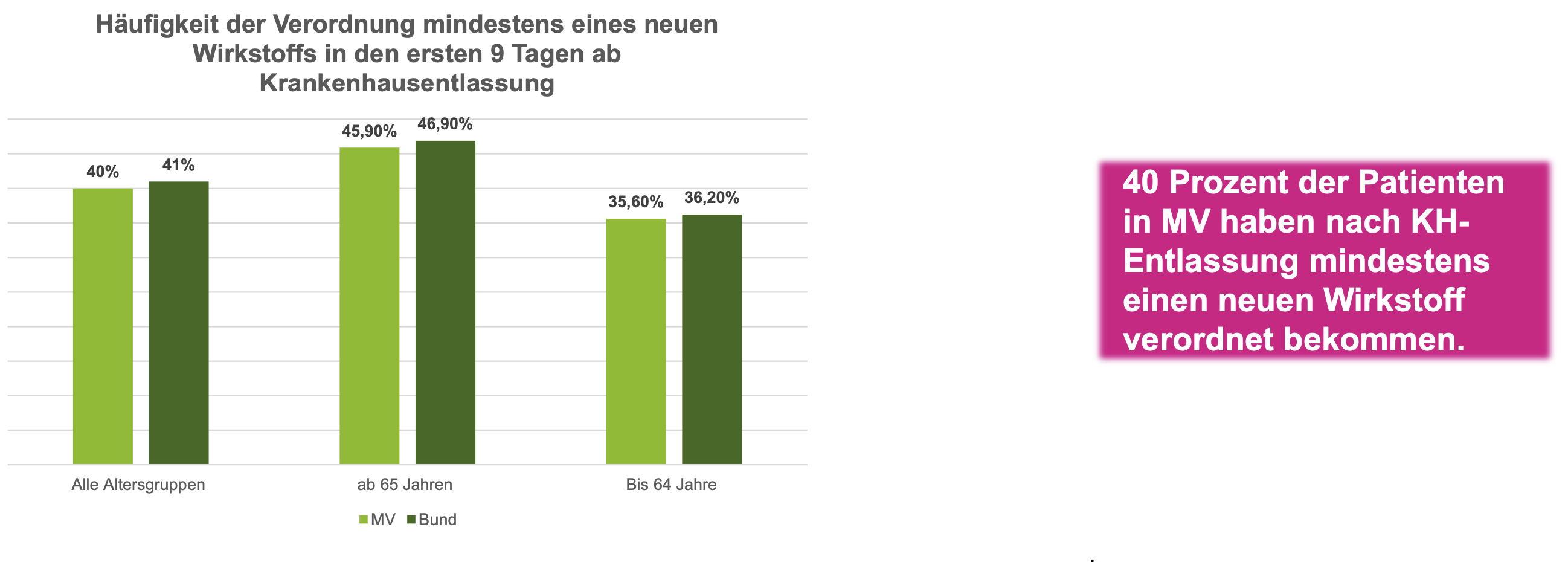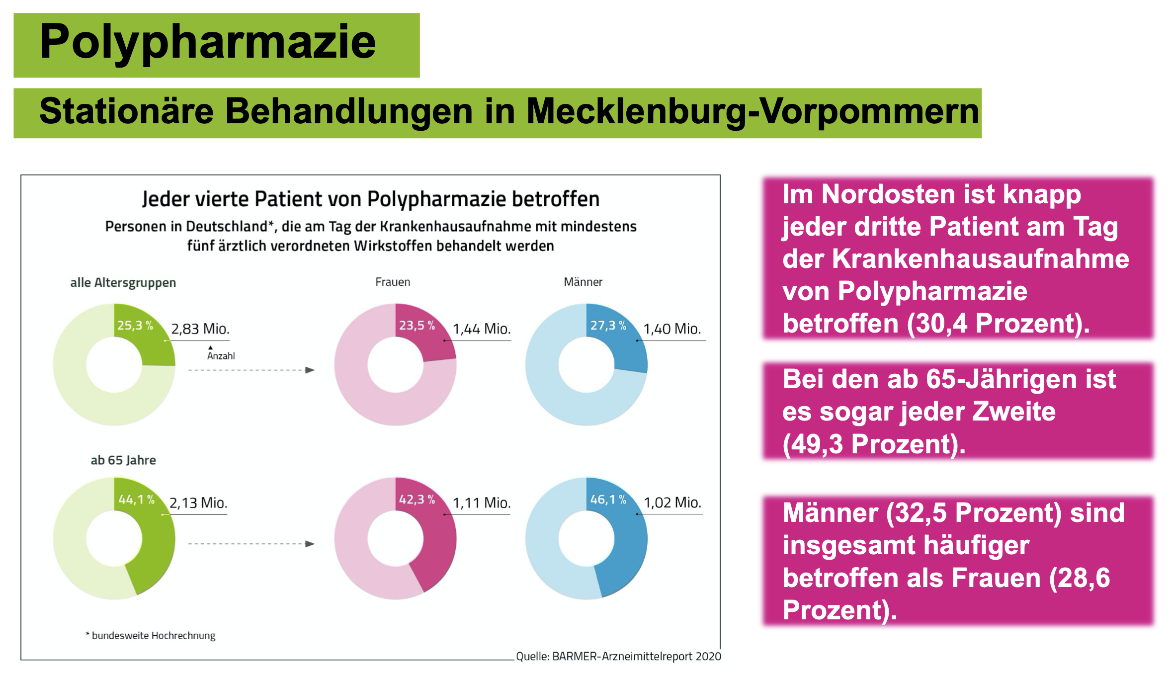 Eine Analyse von Abrechnungsdaten im Arzneimittelreport ergab, dass jeder dritte Patient in Mecklenburg-Vorpommern am Tag der Krankenhausaufnahme fünf Arzneimittel und mehr einnimmt. Bei den ab 65-Jährigen ist es sogar jeder zweite. „Gerade bei dieser vulnerablen Patientengruppe kommt es bei Aufnahme ins und Entlassung aus dem Krankenhaus häufig zu Informationsdefiziten, welche schlimmstenfalls aufgrund von Behandlungsfehlern lebensbedrohlich werden können“, warnt Kutzbach.