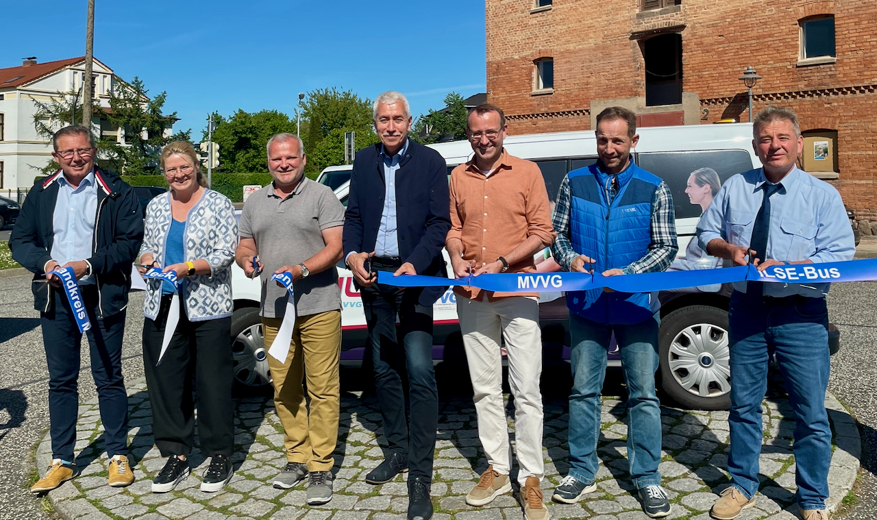 Bild: (v.l.) Stefan Guzu (Bürgermeister Stavenhagen), Maxi Rühlmann (Stadt Waren), Enrico Malow (Bürgermeister Grabowhöfe), Dirk Rautmann, Stefan Bunge (Aufsichtsratsvorsitzender MVVG), Niels Haug (Stadt Penzlin) und MVVG-Geschäftsführer Torsten Grahn gaben die letzte Erweiterung des Rufbussystems ILSE feierlich frei.
