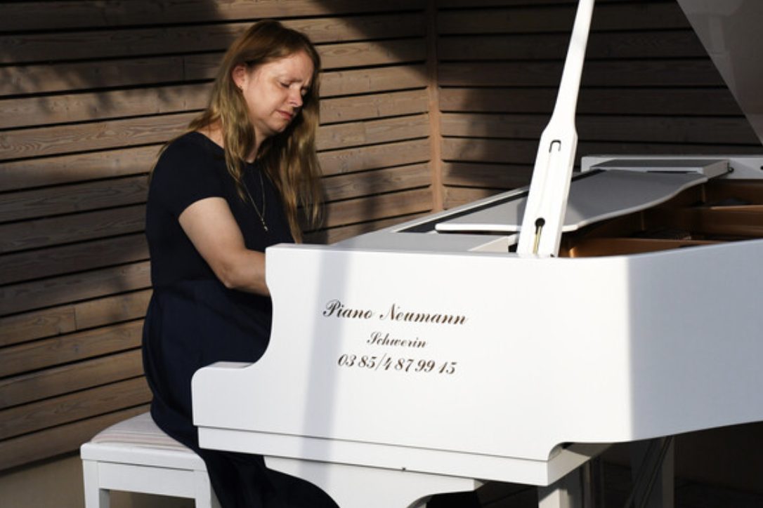 Bild: Pianistin Christiane Klonz am weißen Flügel im Bärenwald-Innenhof.