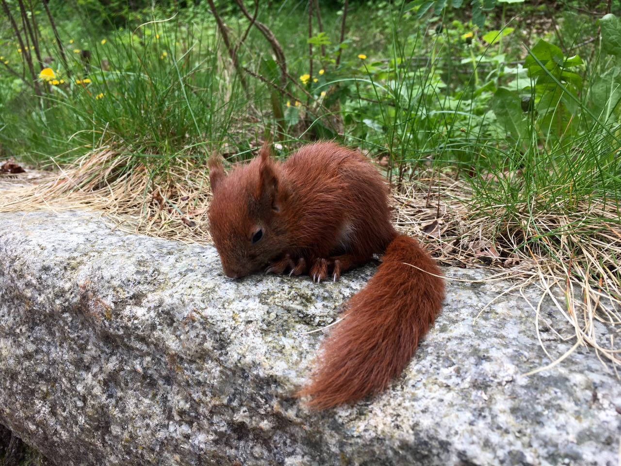 Diesem Eichhörnchen geht es gut, und es ist wieder zurück in seinen Kobel geklettert, wo die Elterntiere und noch ein Geschwisterchen mit ihm leben.