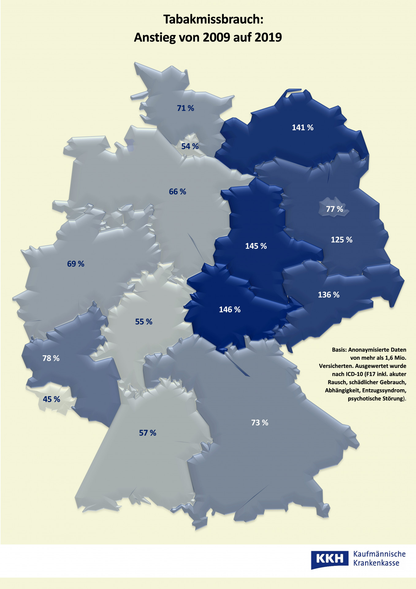 Der missbräuchliche Konsum von Tabak nimmt weiter bedenklich zu – trotz öffentlicher Aufklärungskampagnen und Warnungen von Ärzten. Darauf weist die KKH Kaufmännische Krankenkasse zum heutigen Weltnichtrauchertag hin. Während die Zahl der Alltagsraucher weiter sinkt, ist der Anteil der Exzessiv-Konsumenten in Mecklenburg-Vorpommern umso deutlicher angestiegen: 2019 wurden dort rund 3.400 KKH-Versicherte wegen Tabakabhängigkeit, Entzugserscheinungen, eines akuten Tabakrauschs oder psychischer Probleme aufgrund von Tabak behandelt – im Vergleich zu 2009 ist das ein Plus von rund 141 Prozent. Alarmierend: Die Dunkelziffer dürfte weitaus höher sein, denn die Daten erfassen nur ärztlich diagnostizierten Tabakmissbrauch.