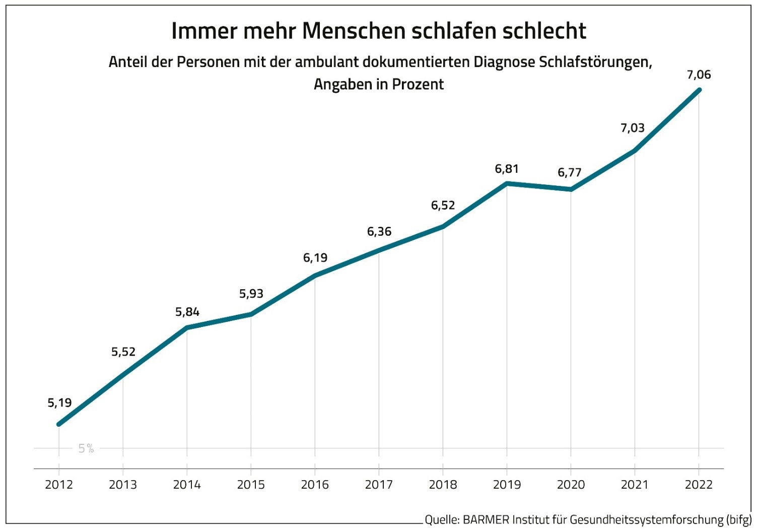 Seit Jahren steigt die Zahl der Menschen in Deutschland mit Schlafstörungen. Das geht aus einer aktuellen Analyse der Barmer hervor, nach der die Zahl ihrer Versicherten mit entsprechender Diagnose in den Jahren 2012 bis 2022 von fünf auf rund sieben Prozent gewachsen ist. Das entspricht rund sechs Millionen Fällen im Jahr 2022 und damit einer Steigerungsrate von 36 Prozent. „Schlafstörungen erhöhen das Risiko für Übergewicht, Schlaganfall, Demenz und Herz-Kreislauf-Erkrankungen. Auslöser für Probleme beim Einschlafen oder Durchschlafen können beruflicher und privater Stress oder bei Frauen die Wechseljahre sein. Schlafstörungen können aber auch erste Anzeichen einer Depression sein. Andauernde Schlaflosigkeit sollte unbedingt in der Arztpraxis abgeklärt werden“, sagt Dr. Ursula Marschall, leitende Medizinerin bei der Barmer.