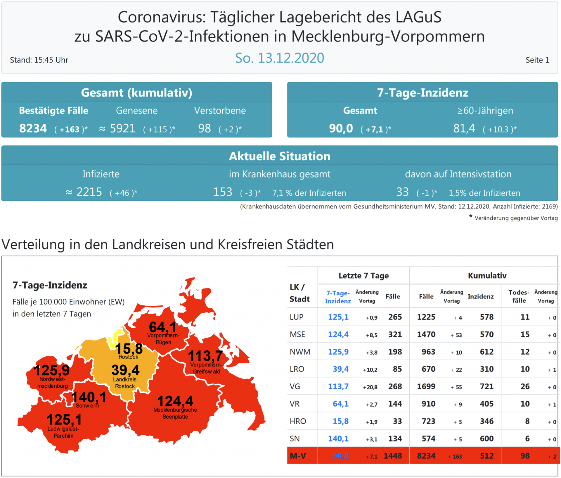 Insgesamt wurden in MV bisher 8234 Infektionen festgestellt. Im Land gab es bislang 98 Todesfälle, zwei mehr als gestern.