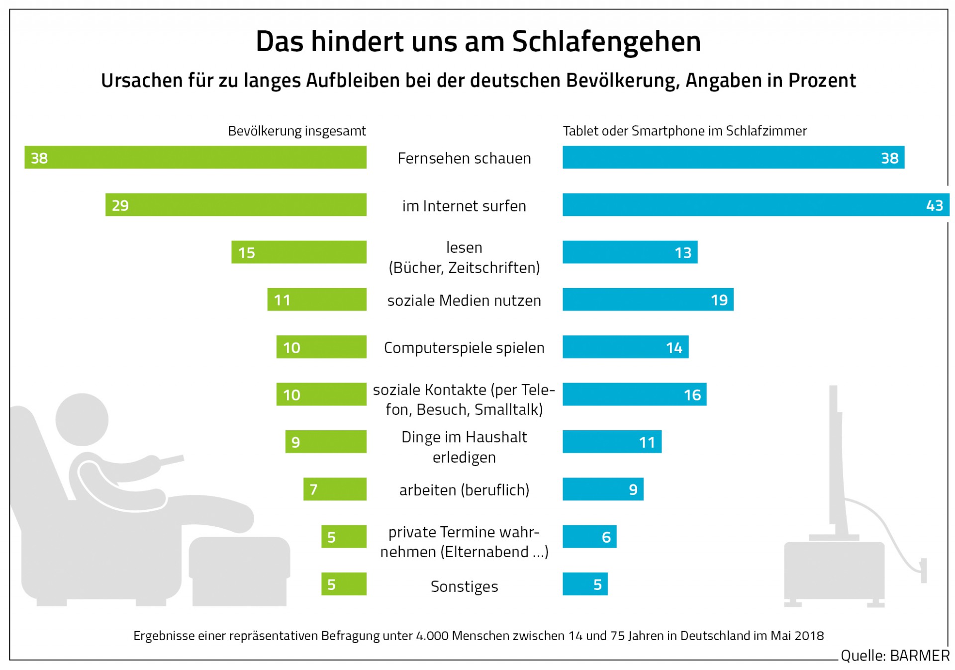 Laut einer repräsentativen Befragung von Menschen zwischen 14 und 75 Jahren im Mai 2018, verhindern oft elektronische Geräte das rechtzeitige Schlafengehen. Ursachen für zu langes Aufbleiben sind das Schauen von Filme und Videos, die Nutzung sozialer Medien oder das Surfen im Internet bis tief in die Nacht hinein. Über die Hälfte der befragten jungen Leute schalten auch frühmorgens, noch vor dem Aufstehen, ihr Handy ein, um die neusten Informationen abzurufen.