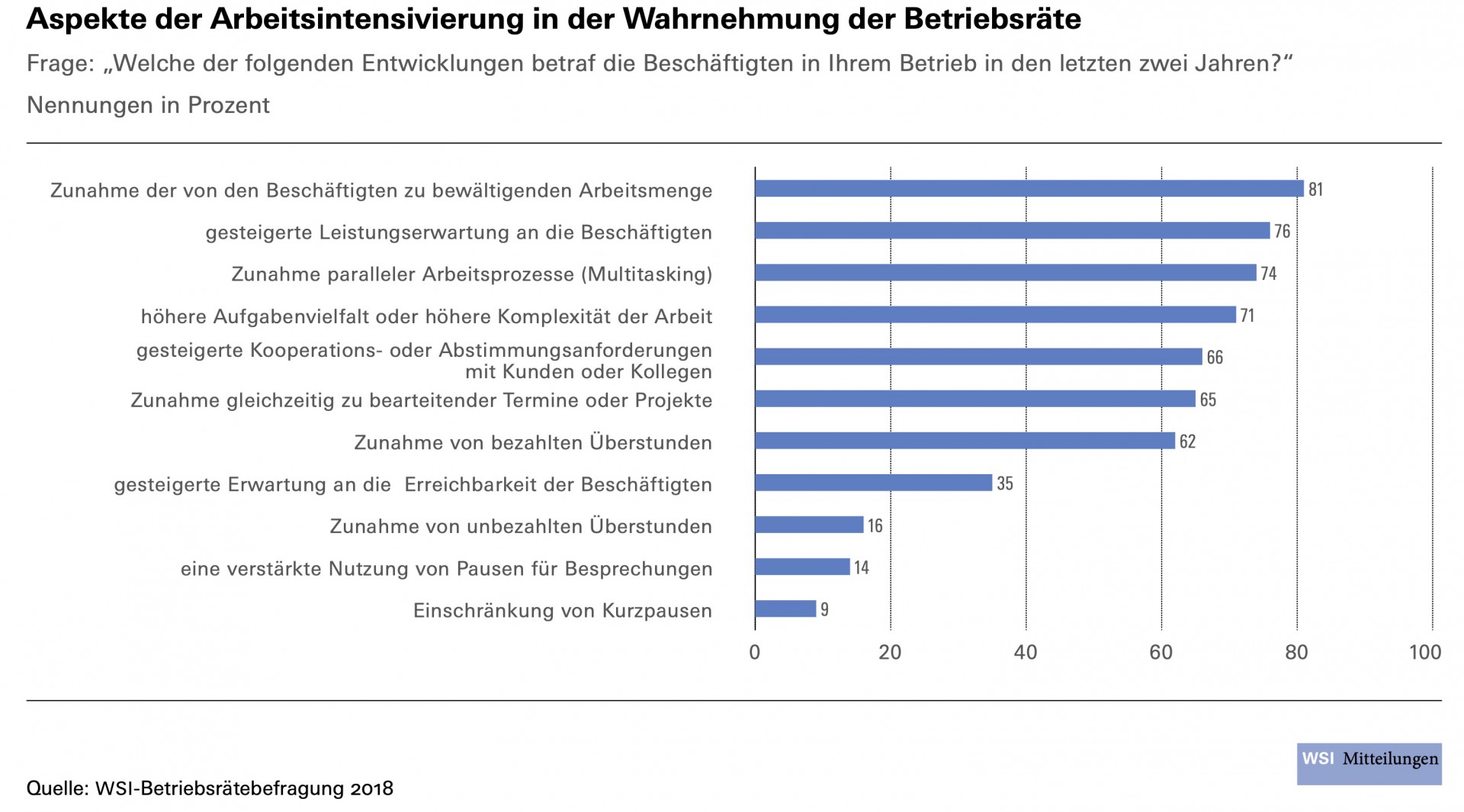 Für ihre Untersuchung hat Arbeitsschutzexpertin Dr. Elke Ahlers die jüngste Welle der WSI-Betriebsrätebefragung ausgewertet, an der 2018 fast 2300 Arbeitnehmervertreter teilgenommen haben. Sie ist repräsentativ für alle Betriebe in Deutschland mit mehr als 20 Beschäftigten und Betriebsrat. 81 Prozent der Befragten geben an, dass die Arbeitsmenge der Beschäftigten in ihrem Unternehmen in den zwei Jahren vor der Befragung zugenommen hat. Jeweils drei Viertel geben höhere Leistungserwartungen und mehr Multitasking zu Protokoll. Von komplexeren und vielfältigeren Aufgaben berichten 71 Prozent, von mehr gleichzeitig zu bearbeitenden Projekten 65 Prozent und von einer Zunahme der bezahlten Überstunden 62 Prozent.