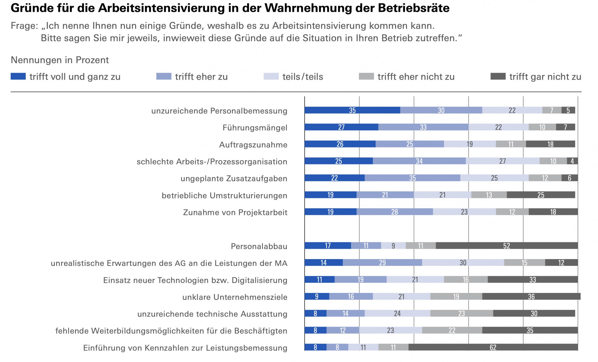 Die Betriebsräte machen mehrere Gründe für die steigende Belastung verantwortlich, einer sticht jedoch heraus: 65 Prozent nennen eine unzureichende Personalausstattung als eine wichtige Ursache. Die Engpässe beruhen nach Angaben der Betriebsräte nicht nur auf Krankenstand oder guter Auftragslage, sondern werden oft als Normalfall beschrieben. Weitere häufig genannte Gründe sind Führungsmängel mit 60 Prozent, schlechte Organisation mit 59 Prozent und ungeplante Zusatzaufgaben mit 57 Prozent.
