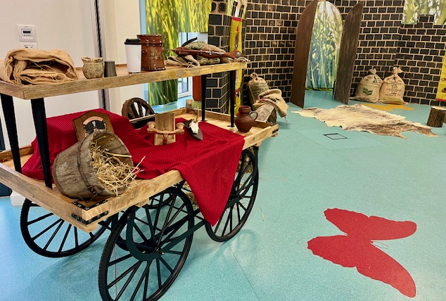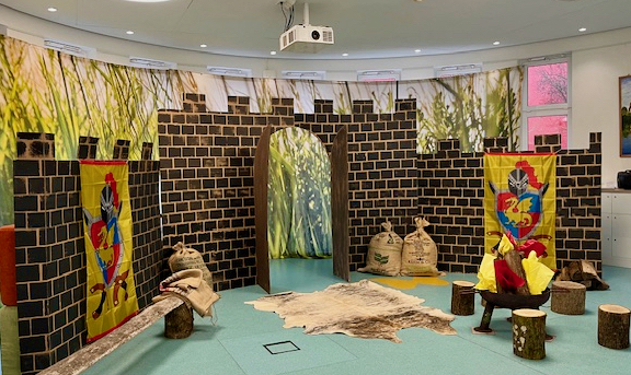 Jeder Morgen startete im „Schmetterlingshaus“ mit einer kleinen mittelalterlichen Theaterrunde mit den Lords und den Ladies aus dem Castle. Entsprechend war dekoriert – eine ganze Burgfassade aus Wellpappe, ein mittelalterlicher Leiterwagen (herzlichen Dank an die Sponsoren Smurfit Kappa und famila) sowie eine riesige Fototapete ließen alle ins Mittelalter abtauchen. Und ja, hin und wieder schaute auch ein Drachen vorbei.