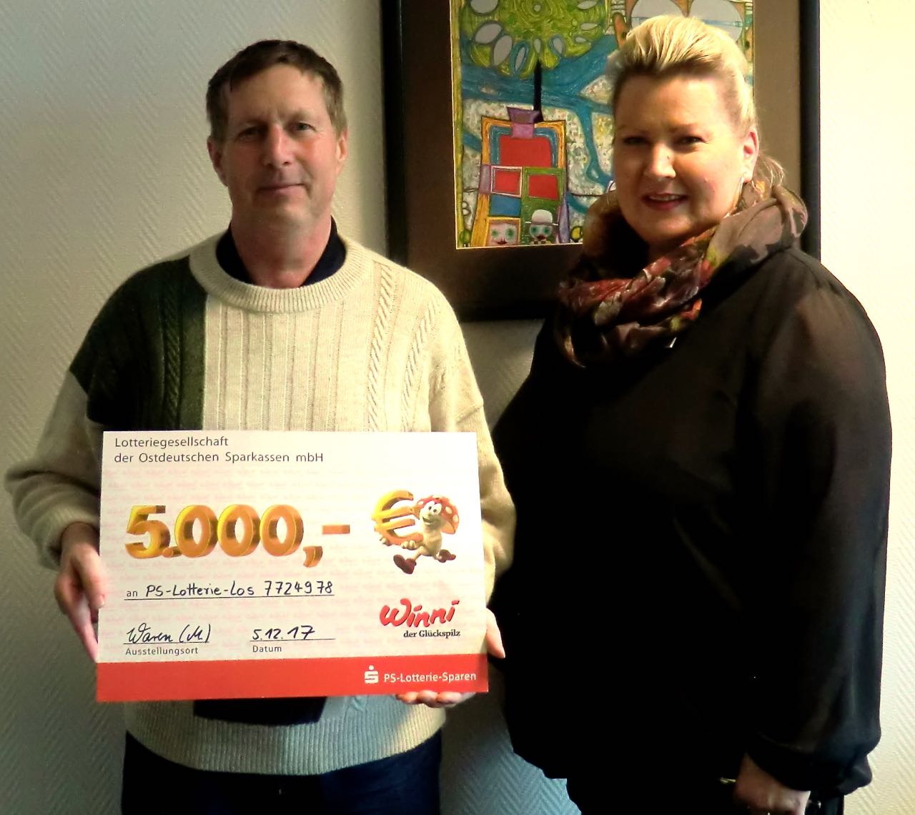 Einer der glücklichen Gewinner ist Dieter Westen. Bei einem kurzfristig unter einem Vorwand vereinbarten Gesprächstermin mit seiner Beraterin Katrin Rettkowski in der Geschäftsstelle Waren West überraschte ihn diese mit einem PS-Los-Gewinn über 5.000 Euro. Dies war eine gelungene Überraschung für Dieter Westen.