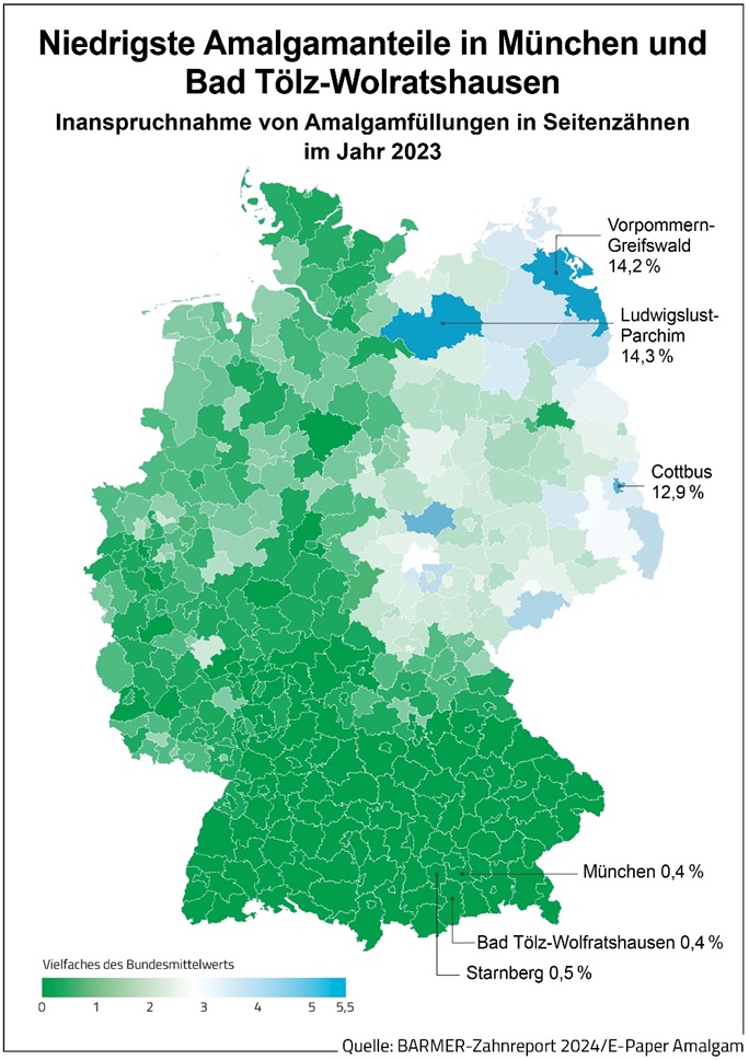 Laut dem Zahnreport erhielten im Jahr 2023 im Landkreis Ludwigslust-Parchim 14,3 Prozent und im Landkreis Vorpommern-Greifswald 14,2 Prozent der Patienten eine Amalgamfüllung im Seitenzahnbereich. Das entspricht mehr als doppelt so vielen Patienten, wie im Landkreis Rostock und in der Landeshauptstadt Schwerin. Hier liegt der Anteil der Amalgamfüllungen bei 5,5 Prozent und 6 Prozent.