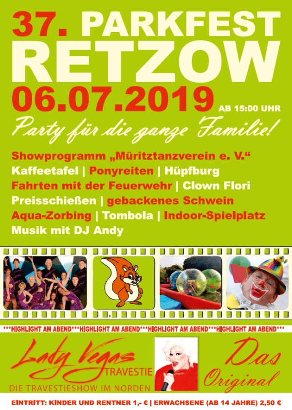 Heute ist es nun endlich wieder soweit – in Retzow wird ordentlich gefeiert. Für das 37. Parkfest wurde wieder ein buntes Programm für Jung und Alt zusammengestellt. Der obligatorische Startschuss fällt um 15 Uhr auf dem Festgelände im Park mit der offiziellen Eröffnung durch den Bürgermeister. Für die Senioren wird traditionell eine gemütliche Kaffeetafel angeboten. Bei Kaffee, selbstgebackenem Kuchen und hoffentlich sonnigem Wetter lassen sich die Darbietungen des Müritztanzverein e.V. besonders gut bestaunen.