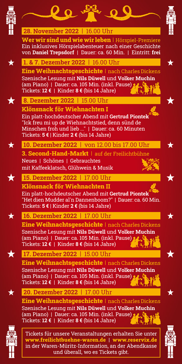 Auch in der „KulturSchänke“ auf der Warener Freilichtbühne wird es weihnachtlich. Am kommenden Montag, 28. November, gibt’s ab 16 Uhr die Hörspiel-Premiere „Wer wir sind und wie wir leben“. Dabei handelt es sich um ein integratives Hörspielprojekt mit vielen Mitwirkenden aus der Müritz-Region. Am 1. und 7. Dezember erzählt Müritz-Saga-Regisseur Nils Düwell „Eine Weihnachtsgeschichte“ nach Charles Dickens, am 8. Dezember snackt die bekannte Stadtführerin Gertrud Piontek ein bisschen Platt und am 10. Dezember wird es fürs Weihnachts-Shopping den dritten Second-Hand-Markt auf der Freilichtbühne geben.