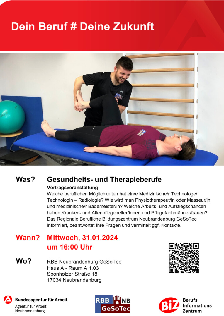 Die Berufsberatung der Agentur für Arbeit Neubrandenburg lädt Schüler am 31. Januar ab 16 Uhr zu einer Vortragsveranstaltung „Ausbildung in Gesundheits- und Therapieberufen“ ein. Die Experten des Regionalen Beruflichen Bildungszentrums Neubrandenburg GeSoTec präsentieren Ausbildungsberufe wie Medizinischer Technologe – Radiologie, Physiotherapeut, Masseur und medizinischer Bademeister, Kranken- und Altenpflegehelfer sowie Pflegefachmänner/frauen.