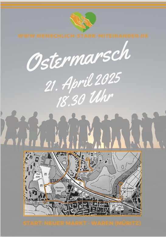 Die Initiative „Menschlich-Stark-Miteinander“ lädt alle friedensliebenden Menschen zum Ostermarsch 2025 in Waren ein. „Ostermärsche sind eine traditionelle Ausdrucksform der Friedensbewegung, die wir ausdrücklich unterstützen“, heißt es in der Einladung.