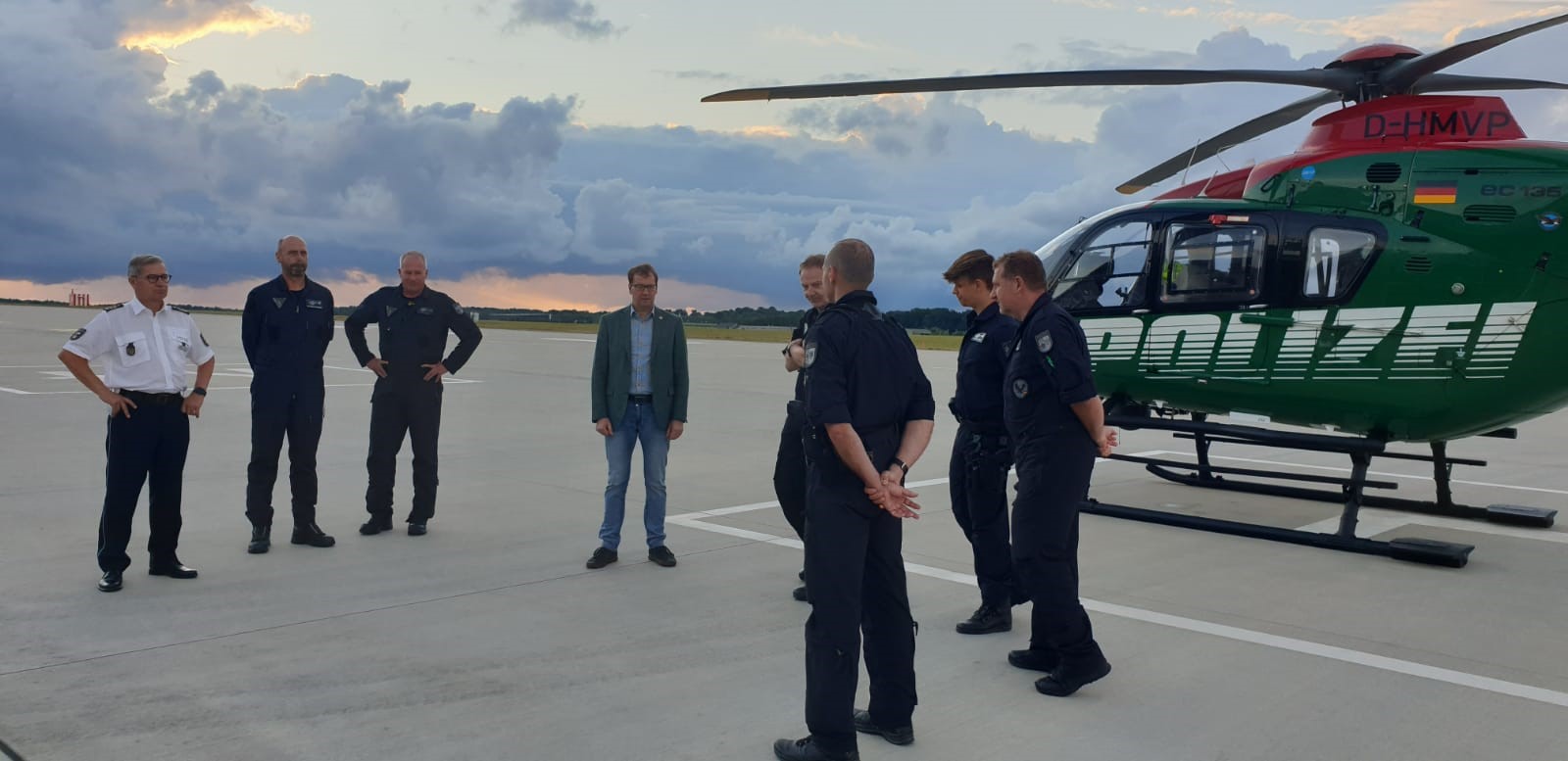 Rückkehr aus dem Katastrophengebiet: Beide Polizeihubschrauber aus Mecklenburg-Vorpommern waren im Einsatz in Rheinland-Pfalz. Sonntagabend kehrte die zweite Hubschrauber-Crew von ihrem Einsatz im Hochwassergebiet Bad Neuenahr-Ahrweiler an ihren Standort Rostock-Laage zurück und wurde dort vom Innenminister des Landes Mecklenburg-Vorpommern, Torsten Renz, begrüßt. Neben den Polizeihubschraubern der Länder Baden-Württemberg, Bayern, Brandenburg, Hessen, Niedersachsen, Sachsen, Sachsen-Anhalt, Thüringen und Rheinland-Pfalz flog die Besatzung aus MV ab dem ersten Tag im Einsatzgebiet zur Aufklärung für die zuständigen Behörden und Organisationen wie THW, Feuerwehr und Bundeswehr. Eine weitere wichtige Aufgabe war aber auch der Material-, Personen- und Hundetransport in die unzugänglichen Gebiete.