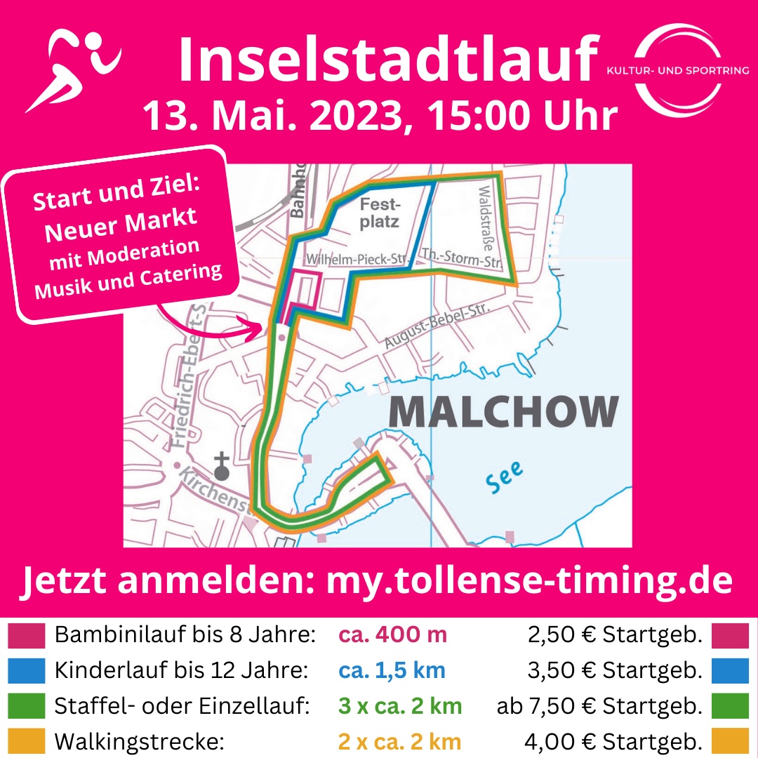 In Malchow wird am 13. Mai wieder zum Inselstadtlauf eingeladen. Geplant sind mehrere Läufe: Gestartet wird am Neuen Markt in Malchow. Nach einer Umrundung der Insel folgen noch zwei weitere Runden über den Malchower Volksfestplatz. Die Anmeldung erfolgt ganz unkompliziert hier: https://my.tollense-timing.de/event/registration?eventid=232618&lang=de Wer nicht mitlaufen möchte, ist herzlich eingeladen zum Anfeuern.