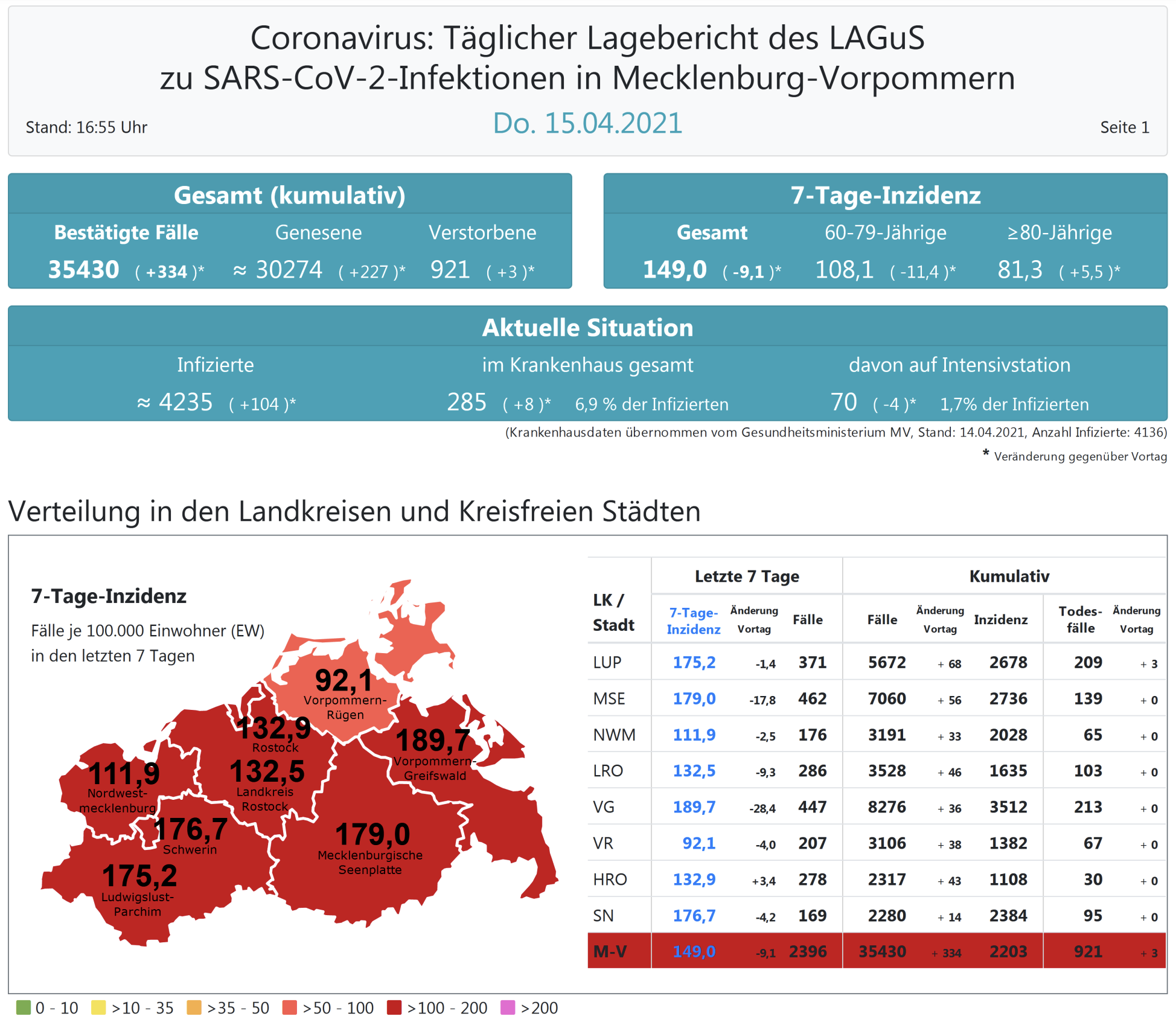 Der Inzidenzwert für ganz Mecklenburg-Vorpommern ist ebenfalls gesunken und liegt heute bei 149,0 (gestern 158,3). Insgesamt meldet das Land Mecklenburg-Vorpommern heute 334 Neuinfektionen.