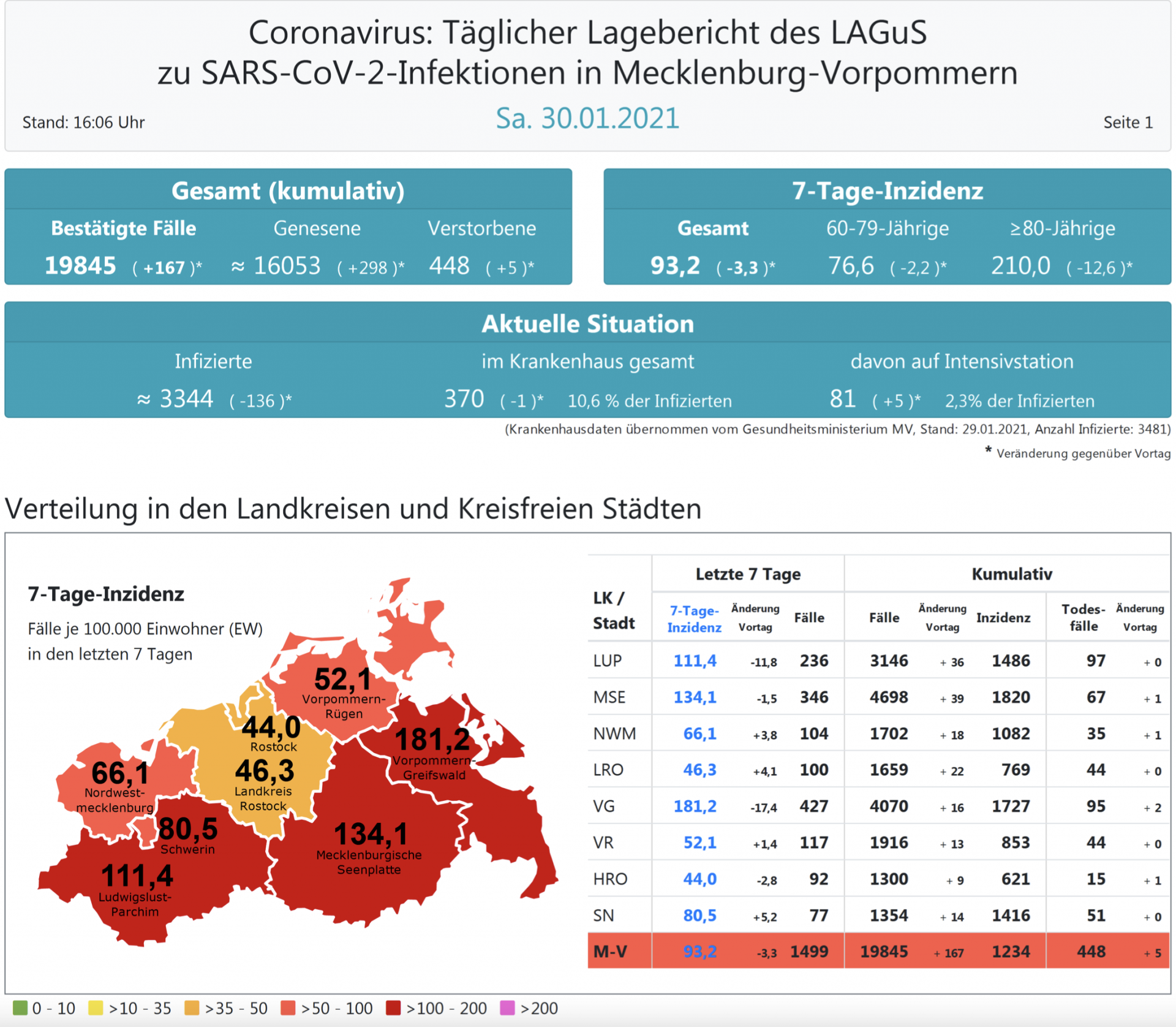 Der Inzidenzwert für ganz Mecklenburg-Vorpommern liegt heute bei 93,3 (gestern 96,6). Insgesamt meldet das Land Mecklenburg-Vorpommern heute 167 Neuinfektionen.