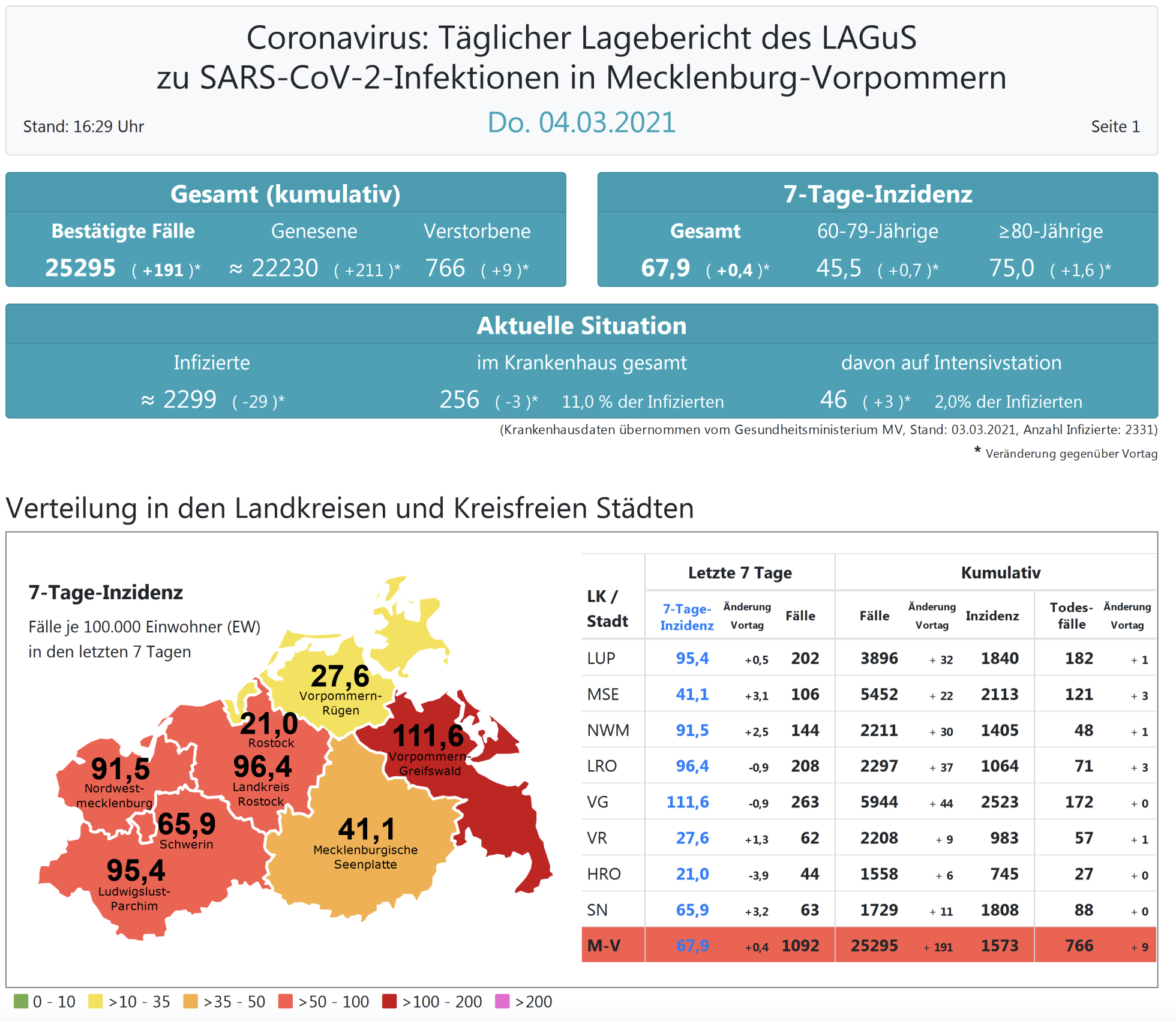 Der Inzidenzwert für ganz Mecklenburg-Vorpommern ist leicht gestiegen und liegt heute bei 67,9 (gestern 67,6 ). Insgesamt meldet das Land Mecklenburg-Vorpommern heute 191 Neuinfektionen. Die höchste Inzidenz hat nach wie vor der Landkreis Vorpommern-Greifswald mit jetzt 111,6.