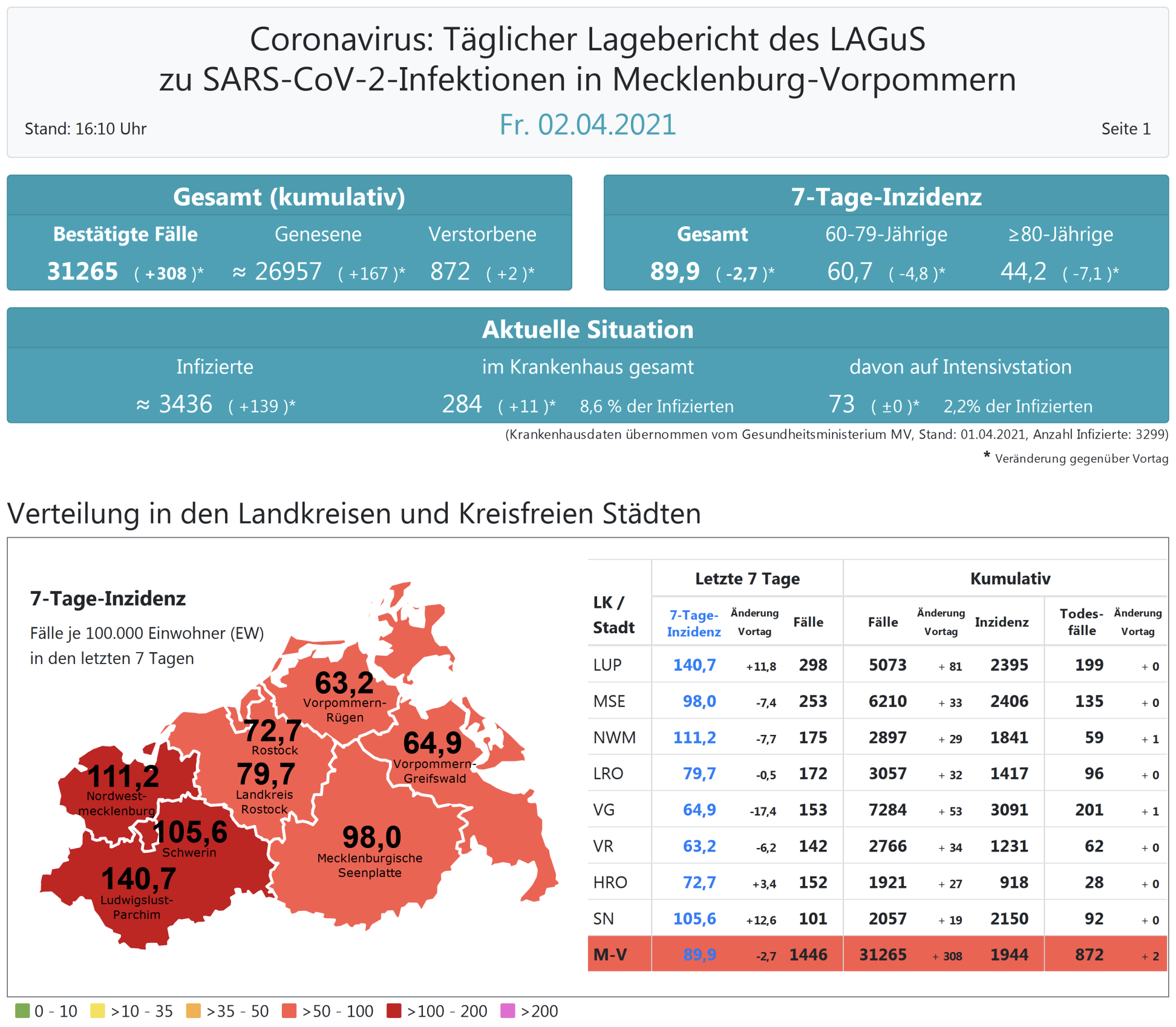 Der Inzidenzwert für ganz Mecklenburg-Vorpommern ist ebenfalls gesunken und liegt heute bei 89,9 (gestern 92,8). Insgesamt meldet das Land Mecklenburg-Vorpommern heute 308 Neuinfektionen. Die höchste Inzidenz hat der Landkreis Ludwigslust-Parchim mit heute 140,7.