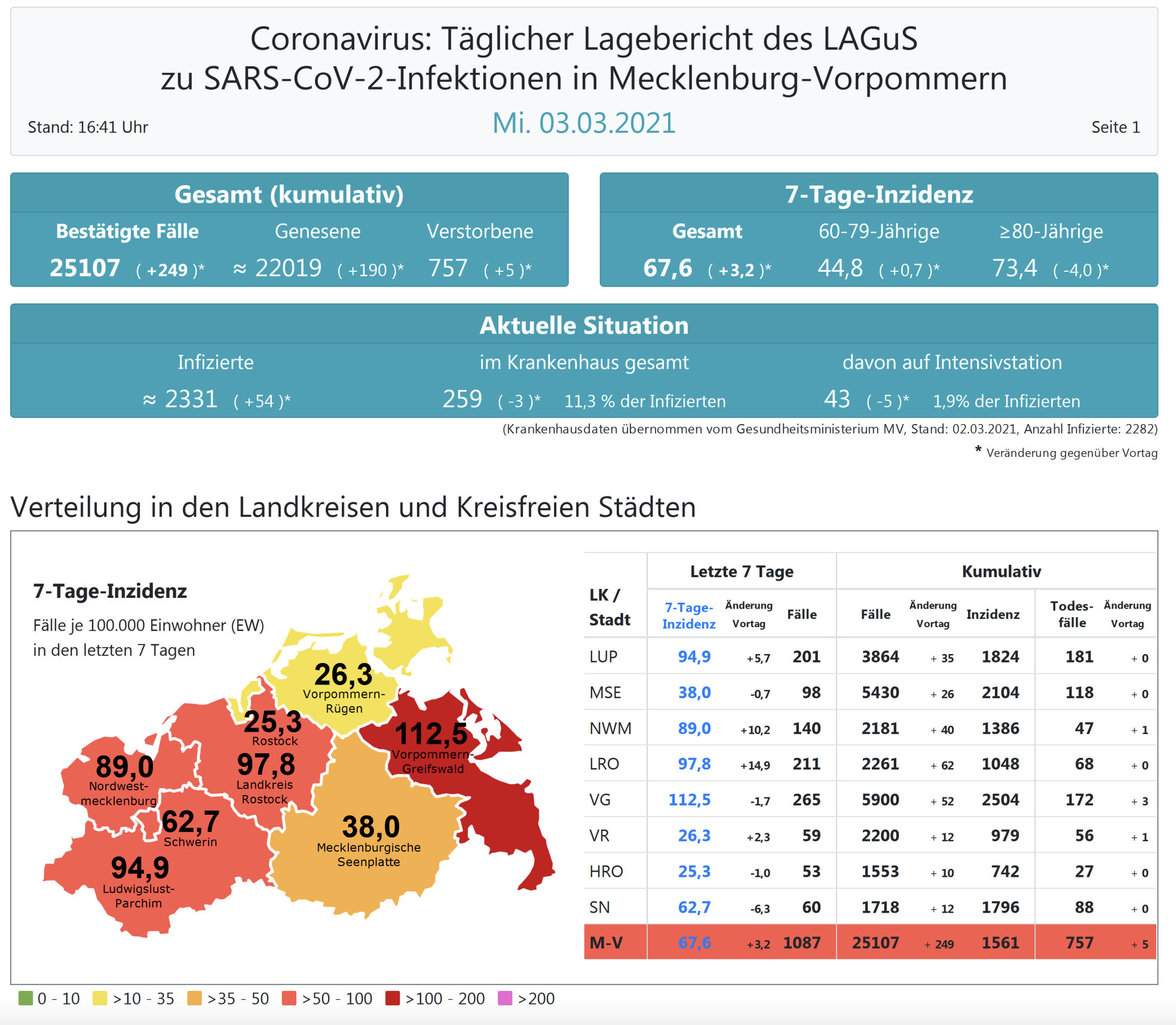 Der Inzidenzwert für ganz Mecklenburg-Vorpommern ist dagegen gestiegen und liegt heute bei 67,6 (gestern 64,7 ). Insgesamt meldet das Land Mecklenburg-Vorpommern heute 249 Neuinfektionen. Die höchste Inzidenz hat nach wie vor der Landkreis Vorpommern-Greifswald mit jetzt 112,5.