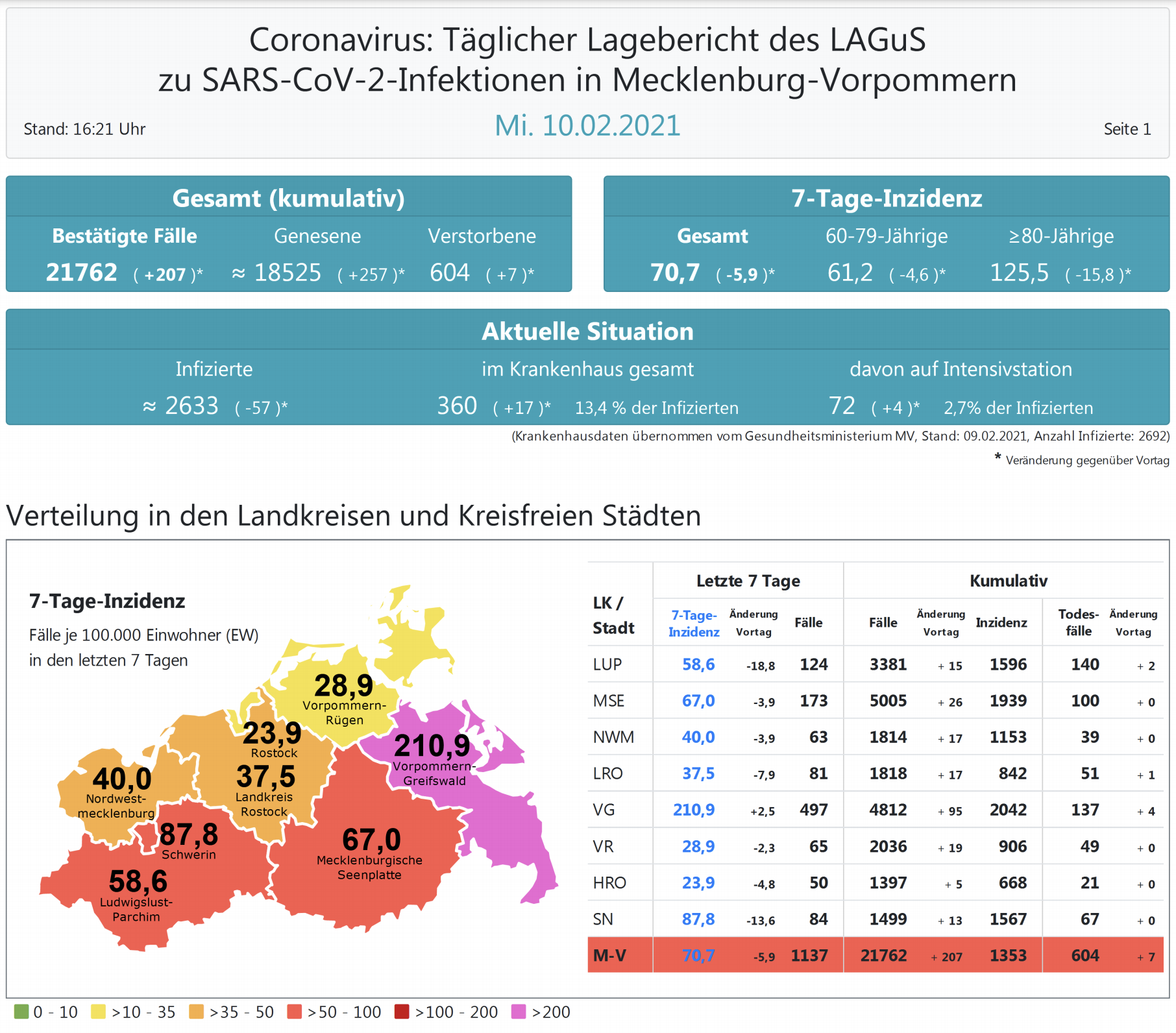 Der Inzidenzwert für ganz Mecklenburg-Vorpommern liegt heute bei 70,7 (gestern 76,7). Insgesamt meldet das Land Mecklenburg-Vorpommern heute 207 Neuinfektionen. Ein Landkreis überschreitet nach wie vor die 200-er Schwelle – Vorpommern-Greifswald mit 210,9.