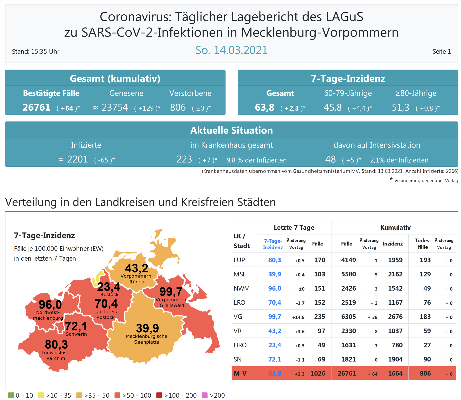 Der Inzidenzwert für ganz Mecklenburg-Vorpommern ist gestiegen und liegt heute bei 63,8 (gestern 61,5 ). Insgesamt meldet das Land Mecklenburg-Vorpommern heute 64 Neuinfektionen. Die höchste Inzidenz hat der Landkreis Vorpommern-Greifswald mit heute 99,7.