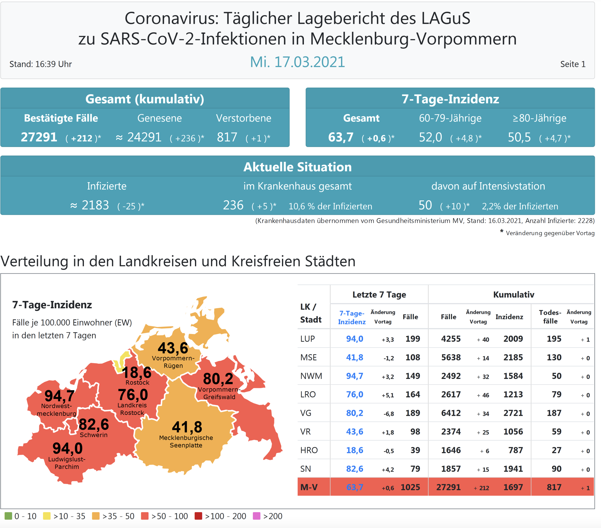 Der Inzidenzwert für ganz Mecklenburg-Vorpommern ist ebenfalls leicht gesunken und liegt heute bei 63,7 (gestern 64,3 ). Insgesamt meldet das Land Mecklenburg-Vorpommern heute 212 Neuinfektionen. Die höchste Inzidenz hat der Landkreis Nordwestmecklenburg mit heute 94,7