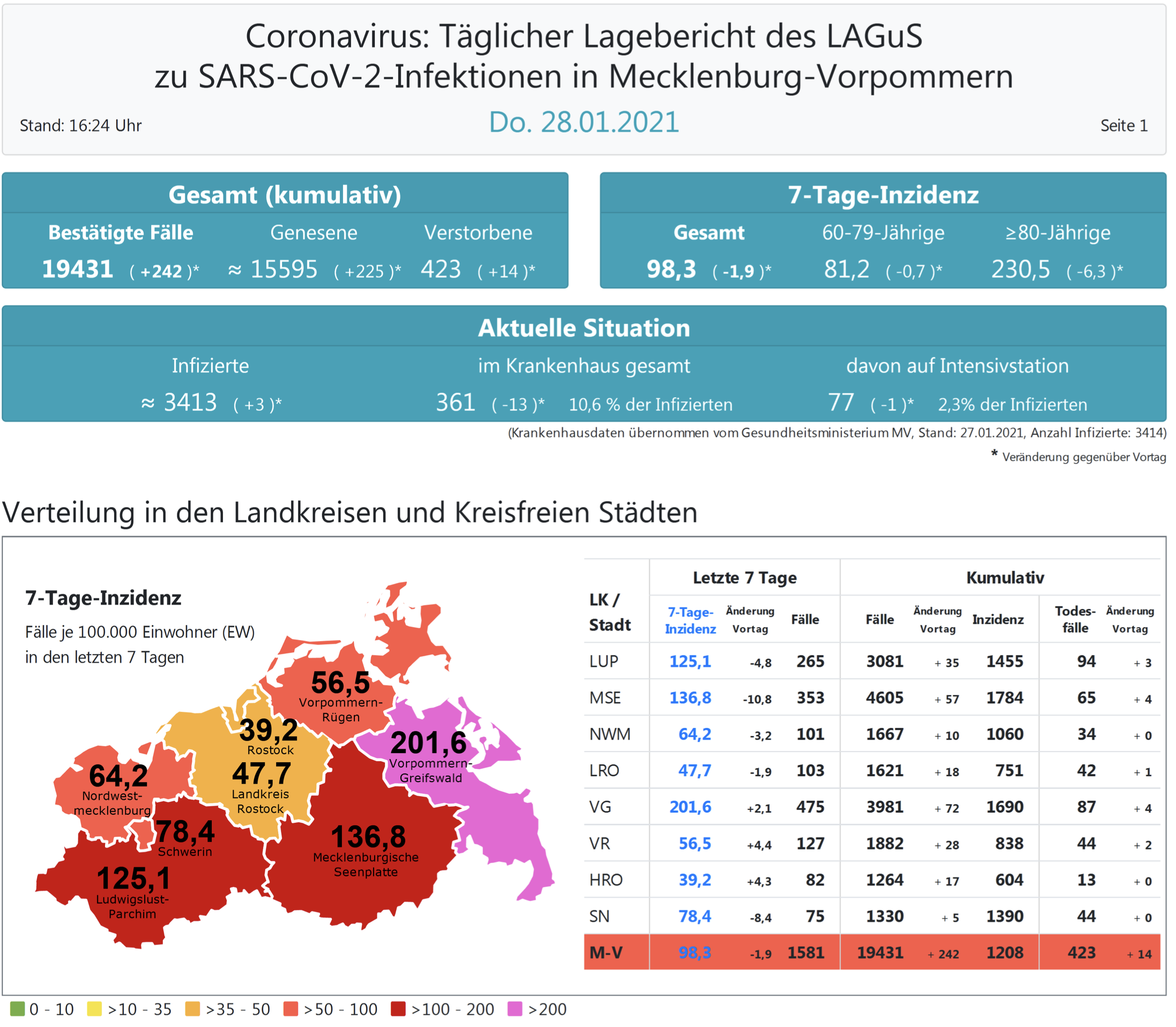 Insgesamt meldet das Land Mecklenburg-Vorpommern heute 242 Neuinfektionen.