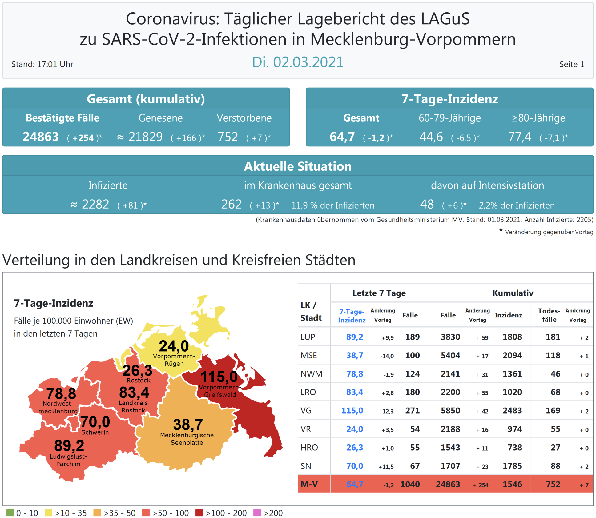 In ganz Mecklenburg-Vorpommern wurden bisher 24 863 Infektionen festgestellt. Im Land gab es bislang 752 Todesfälle und damit 7 mehr als gestern.