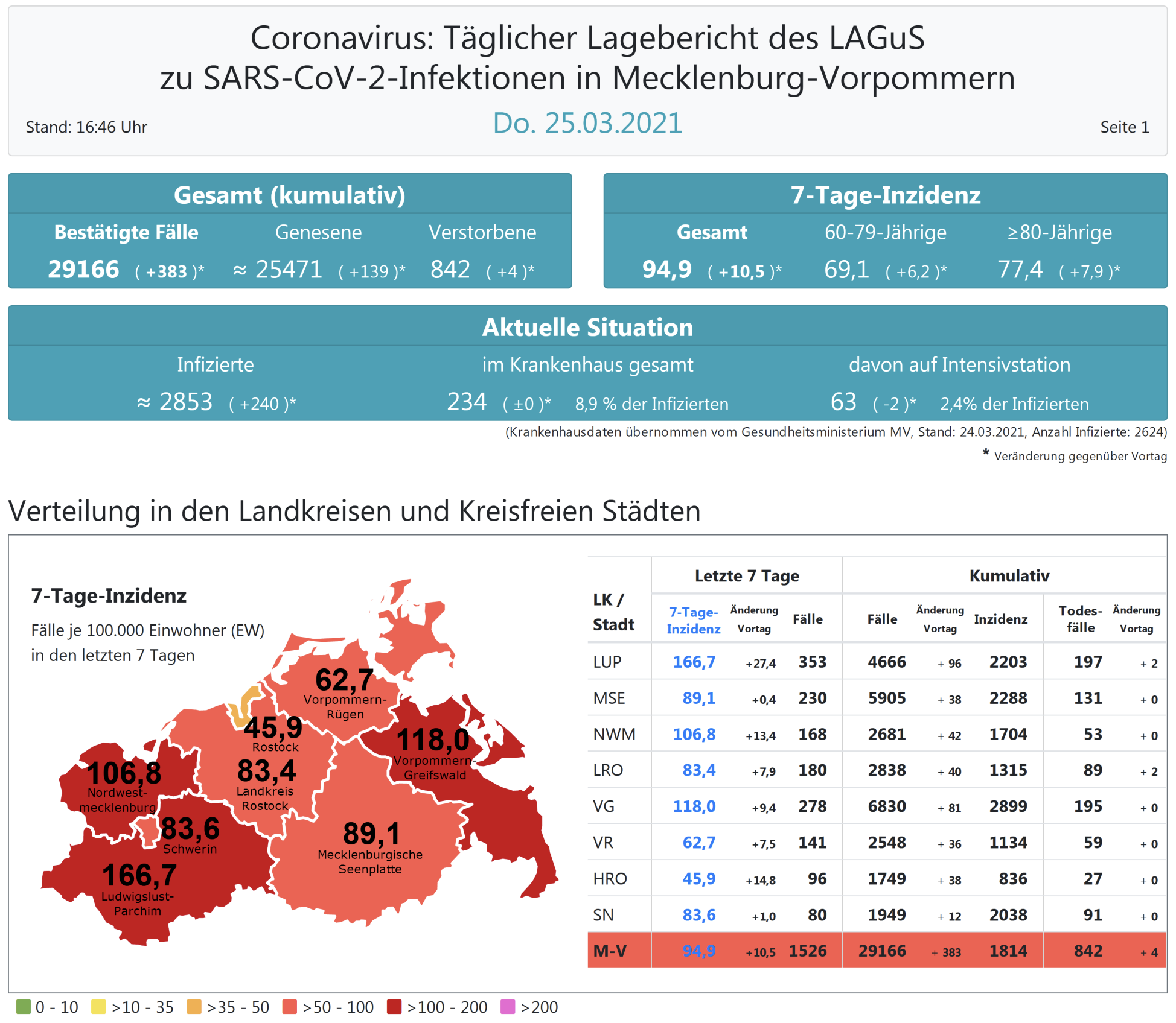 Der Inzidenzwert für ganz Mecklenburg-Vorpommern ist ebenfalls weiter gestiegen und liegt heute bei 94,9 (gestern 84,9). Insgesamt meldet das Land Mecklenburg-Vorpommern heute 383 Neuinfektionen. Die höchste Inzidenz hat der Landkreis Ludwigslust-Parchim mit heute 166,7.